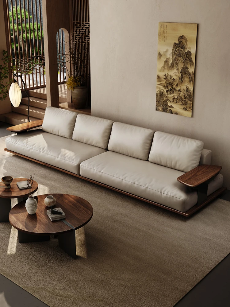 黒胡桃の無垢材と本革を使用した、コンパクトな新中式スタイルのソファ。美しい宋代の美学を感じる、上質なトップグレイン牛革ソファで、リビングルームを洗練された空間に演出します。