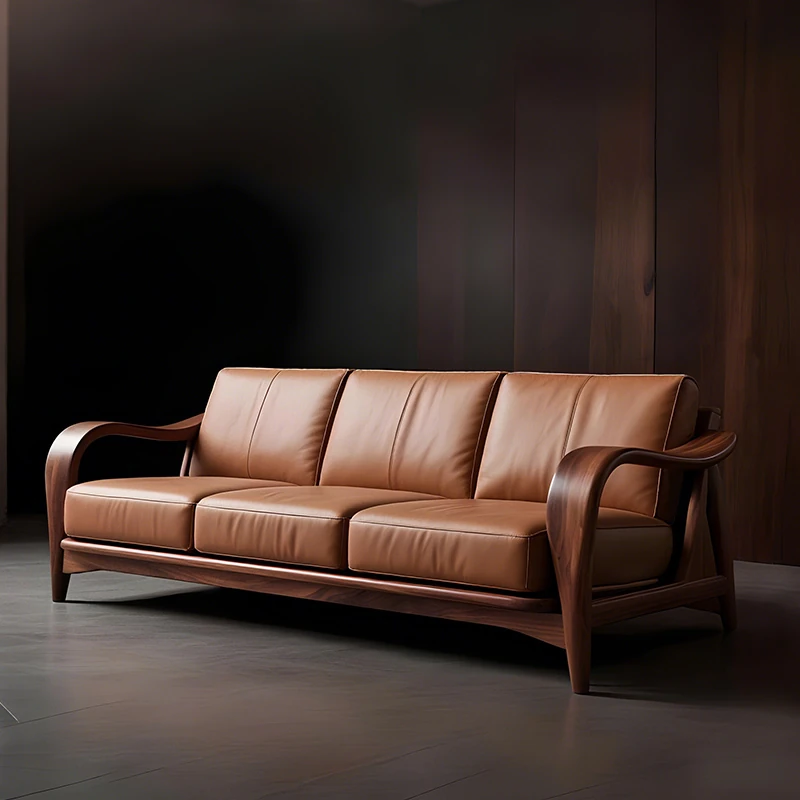 イタリアンミニマリズムの無垢材ソファ2025新作!ウォールナット仕上げのリビング用ライトラグジュアリー本革ソファ、小型住宅向けの3〜4人掛け。洗練されたデザインで、居心地の良い空間を演出します!