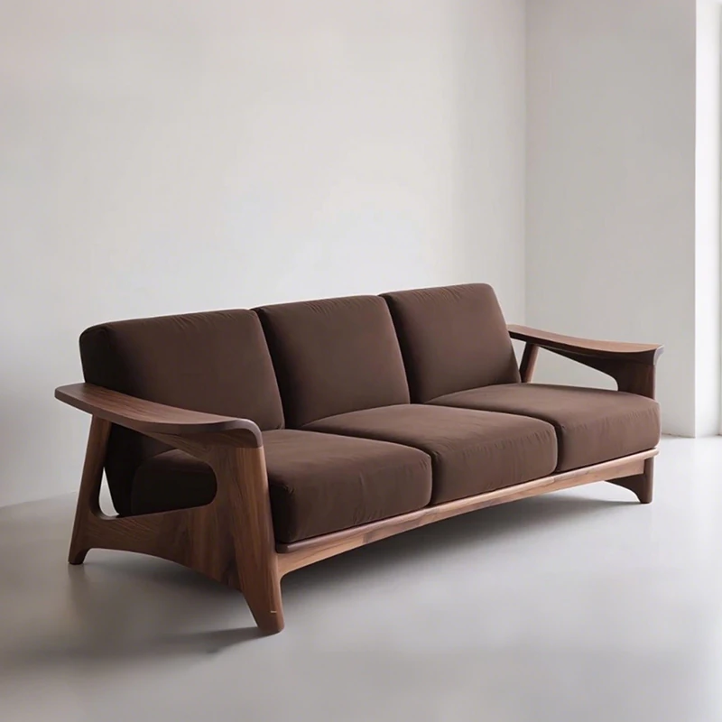 高級感あふれる中古風の無垢材ソファ、2025年新作デザイン!高級ブラックウォールナットを使用したリビング用3人掛け布製ソファで、スタイリッシュな空間を演出します。快適さと美しさを兼ね備えた一品です。