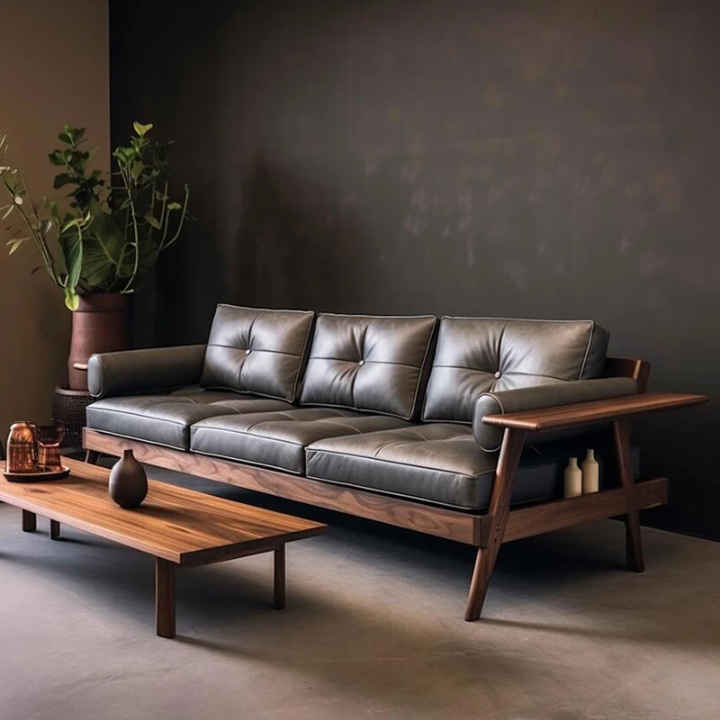 高級感溢れる!2025年新作 中古風リアルウッドソファー - ブラックウォールナット無垢材&本革仕上げ。ヴィラのリビングに最適な直線デザインで、上質なひとときを演出します!