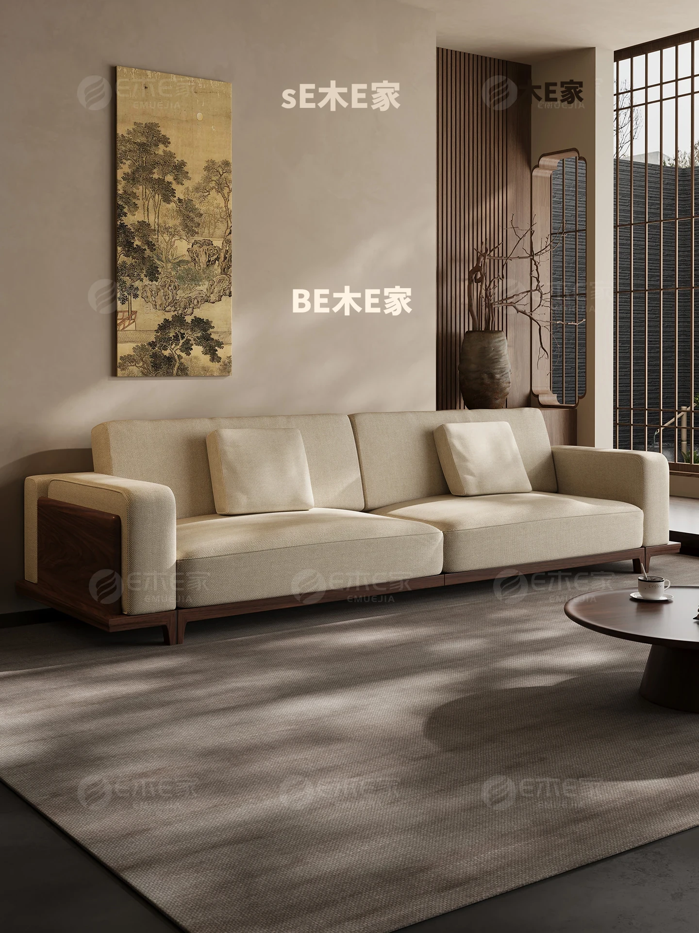 宋風美学のブラックウォールナット製コットンリネンソファー - Zenスタイルの直線デザイン、4人掛けの新中式ソファー、2025年新作登場!心安らぐひとときを提供します。