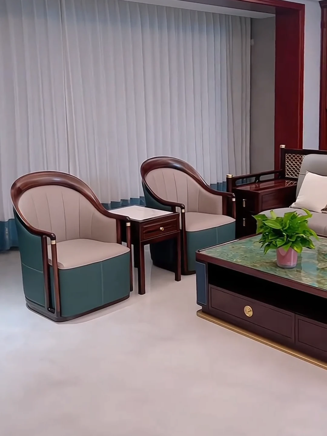 新中式のウッドブラックリビングルーム別荘向け軽奢禅スタイル、緑の植物と森を感じる本格的な木製&本革ソファセットで、心地よい空間を演出します。