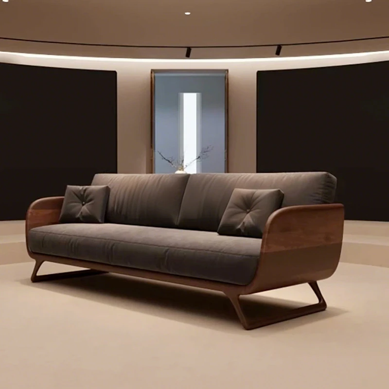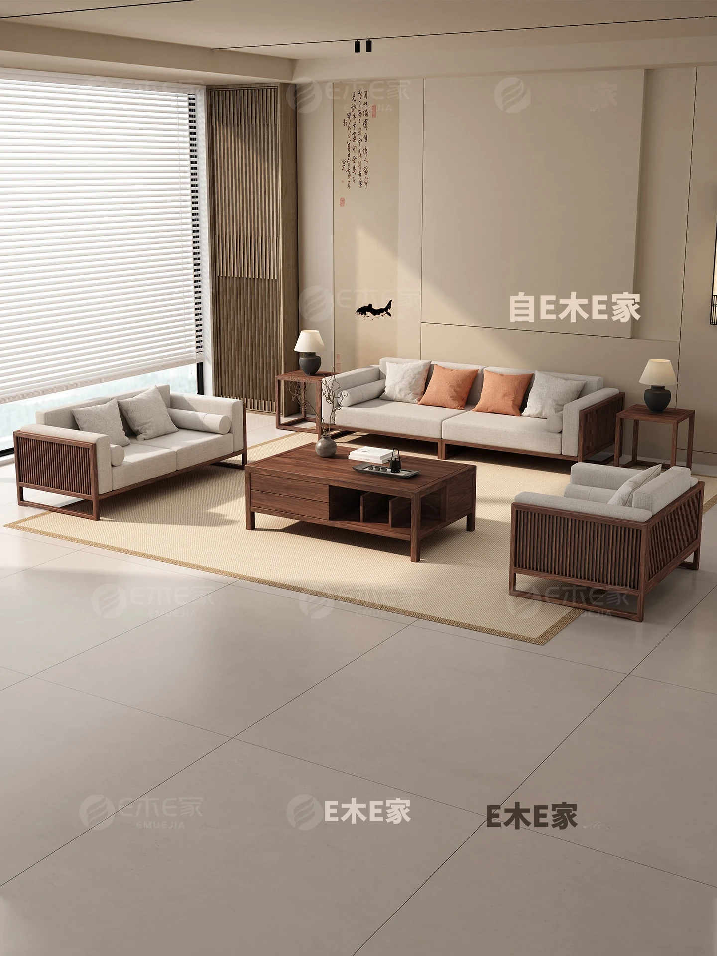 2025年新作!高級黒胡桃木使用の新中式実木ソファ。シンプルでスタイリッシュな布張りデザイン、リビングルームにぴったりの上質な家具。快適な座り心地と洗練された美しさを兼ね備えた一品!