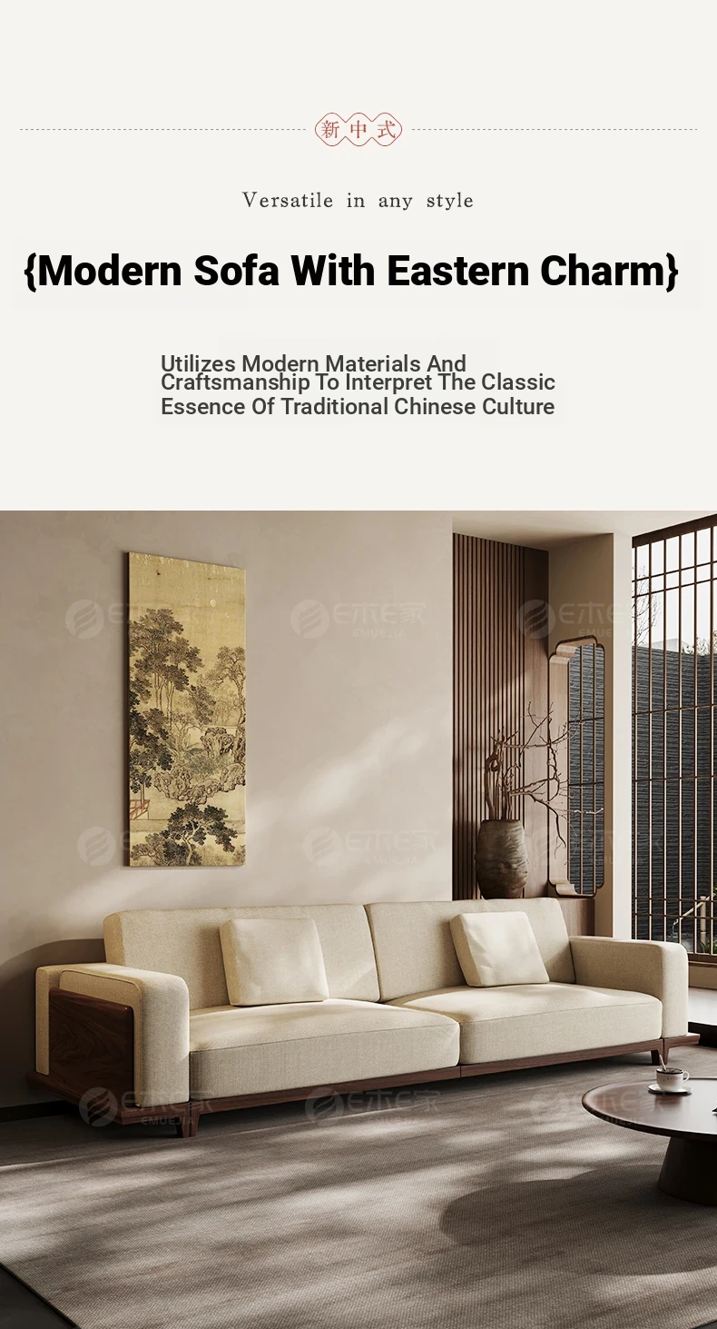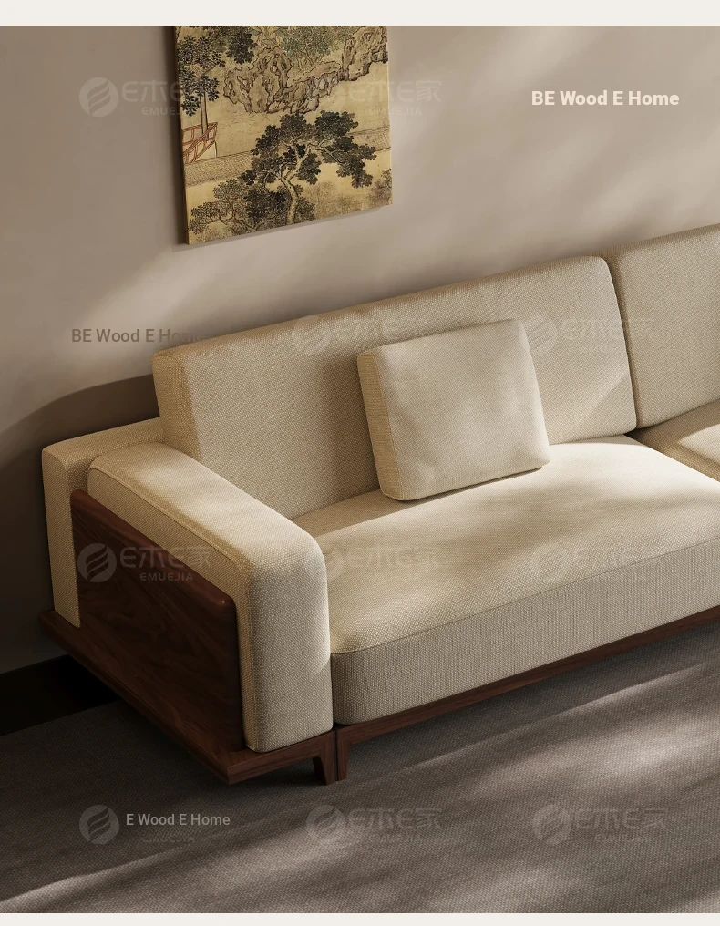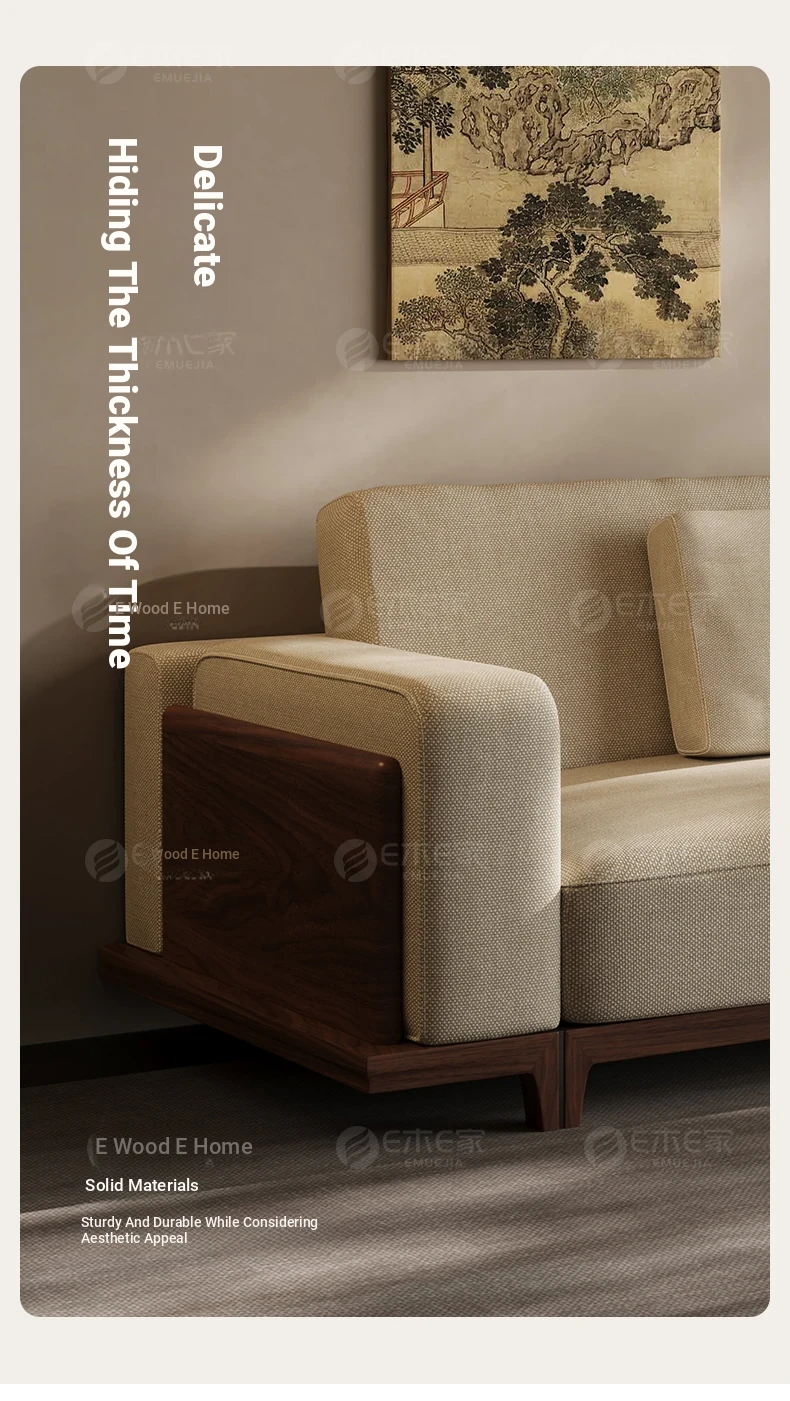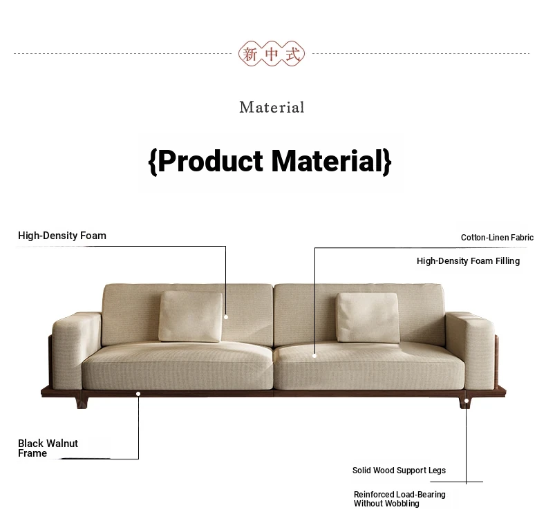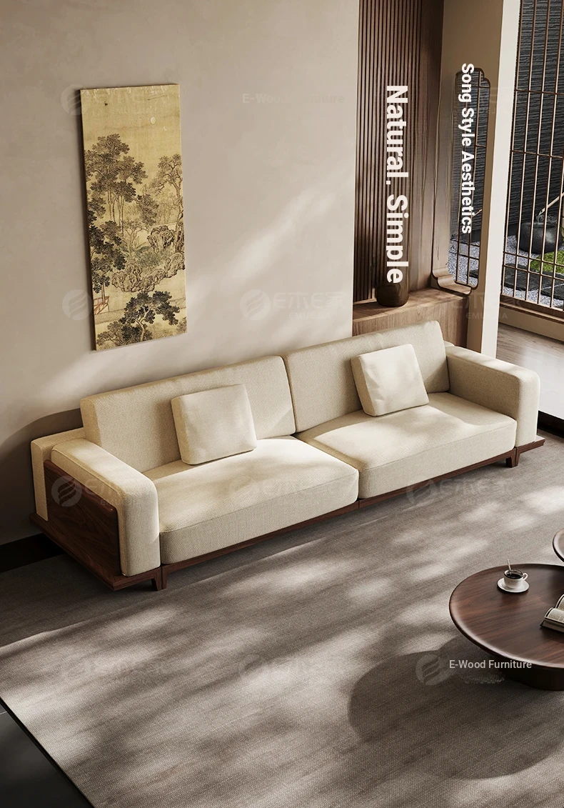 2025 New Arrival: Song Style Aesthetic Black Walnut Cotton Linen Sofa - Zen-Inspired Straight Wooden Four-Seater in Modern Chinese Design