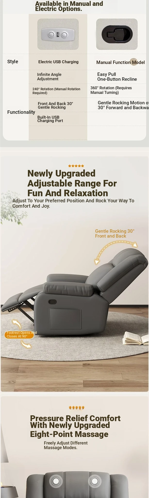 Electric adjustable sitting + swing + massage + USB charging