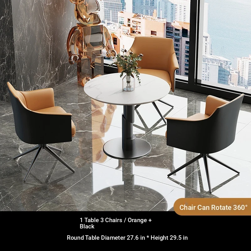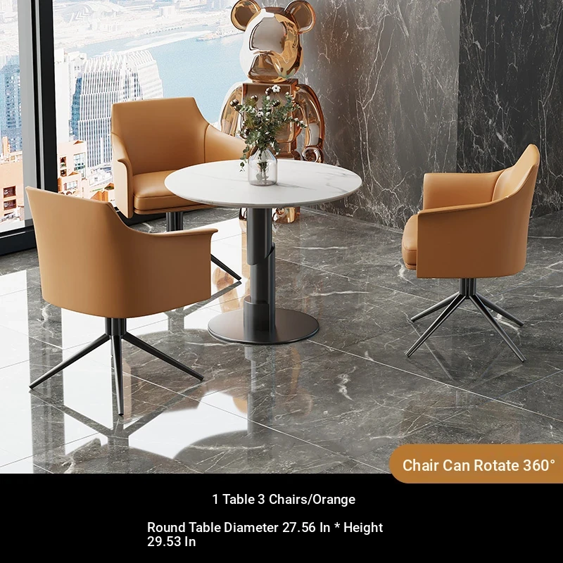 1 table 3 chairs: orange / western leather / rotating + round: 27.56in*29.53in [ snow mountain white platform ]