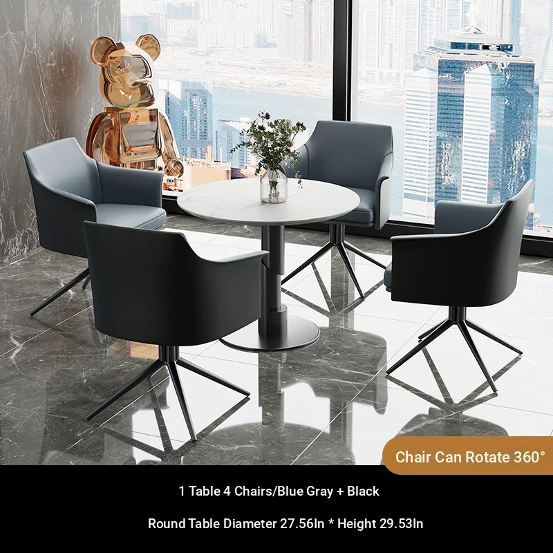 1 table 4 chairs: blue gray + black / western leather / rotated + round: 27.56in*29.53in [ snow mountain white platform ]