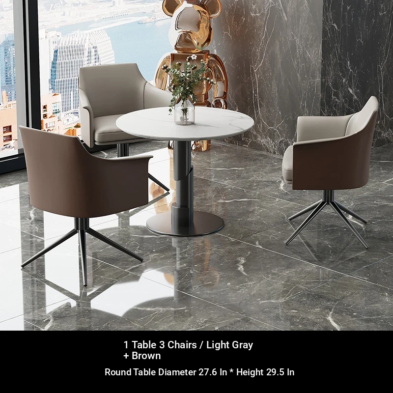 1 table 3 chairs: gray + brown / western leather / rotated + round: 27.56in*29.53in [ snow mountain white platform ]