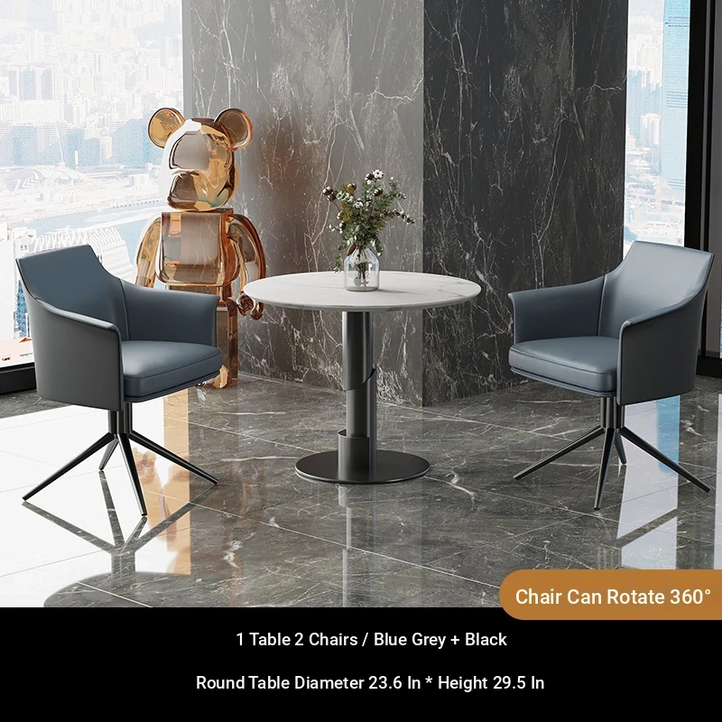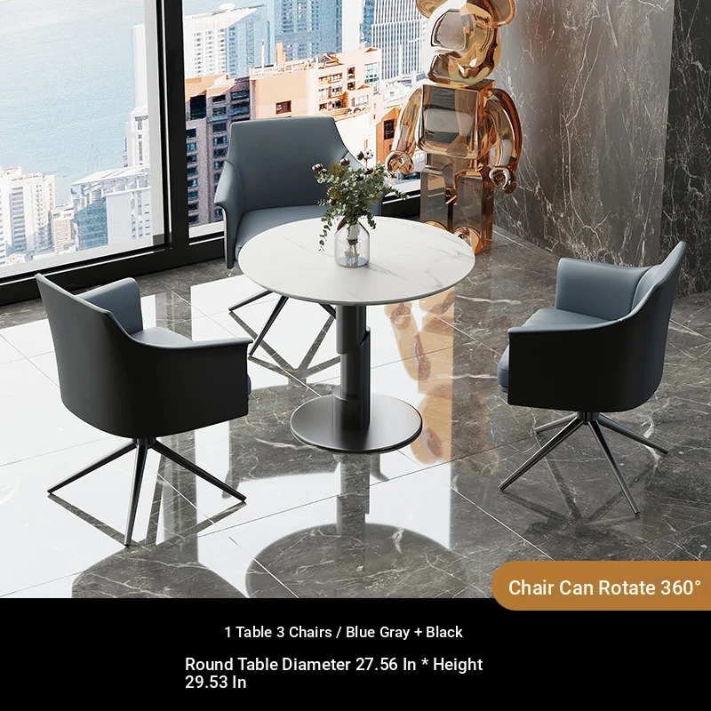 1 table 3 chairs: blue gray + black / western leather / rotated + round: 27.56in*29.53in [ snow mountain white platform ]