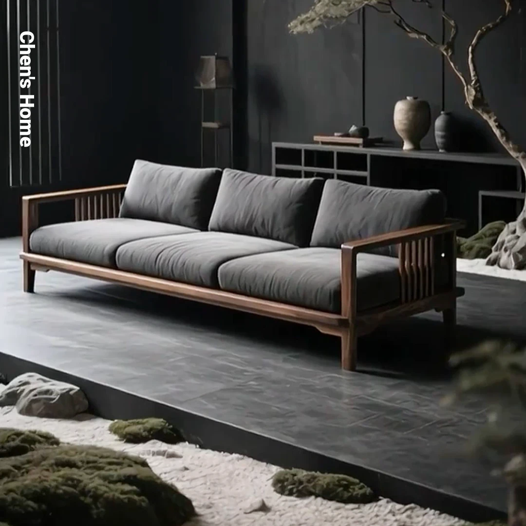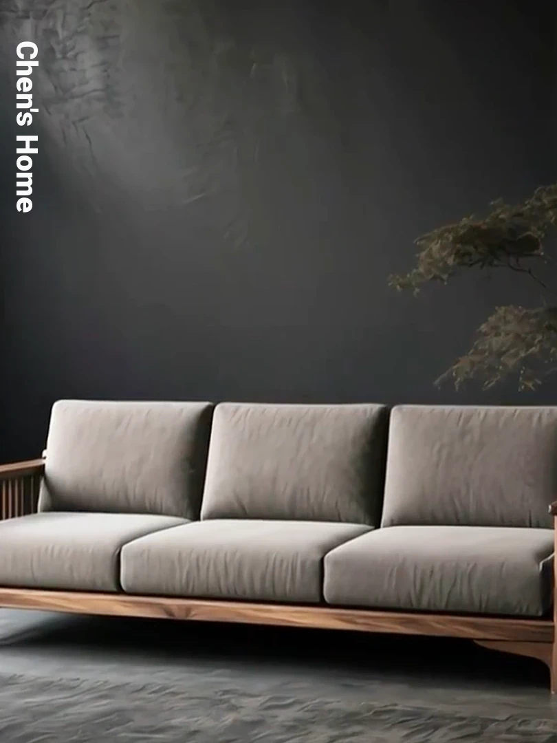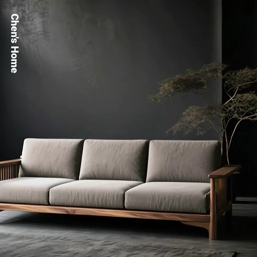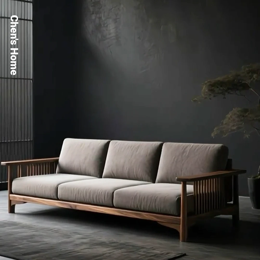 Modern Minimalist New Chinese Style Upholstered Sofa - Luxurious Black Walnut Three-Seat for Villa Living Room, Perfect Blend of Elegance and Comfort