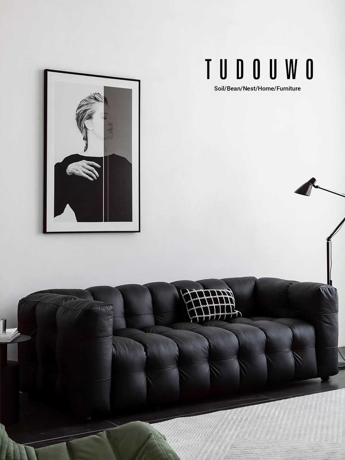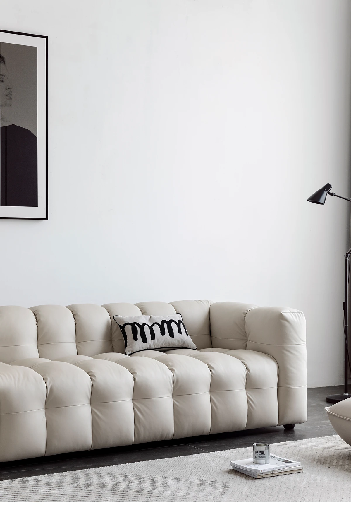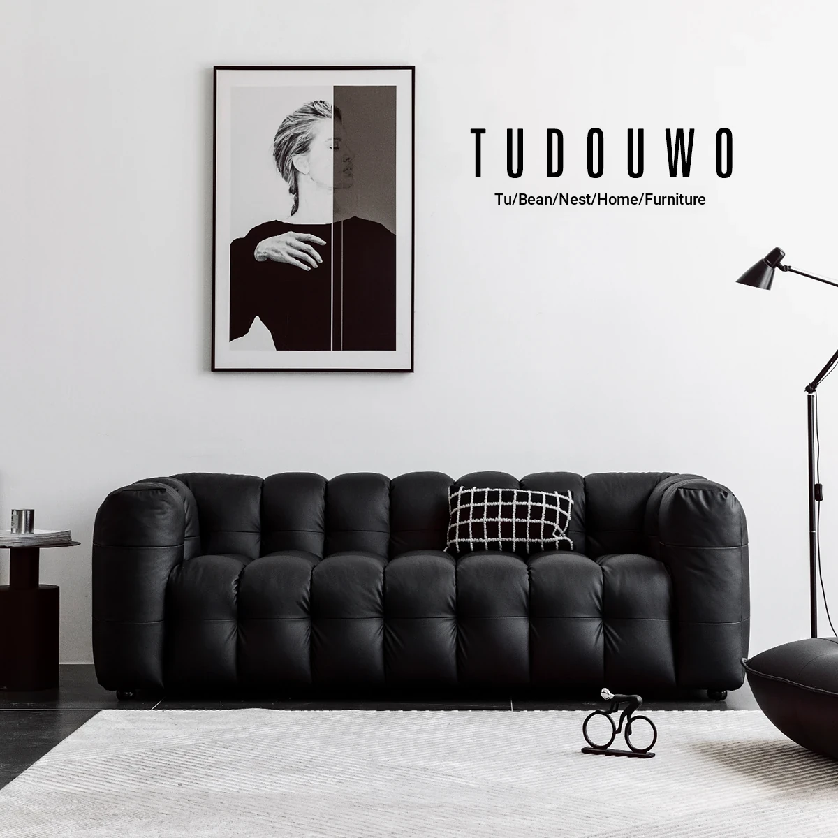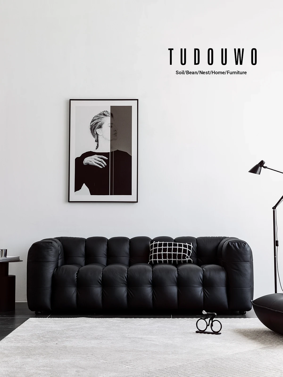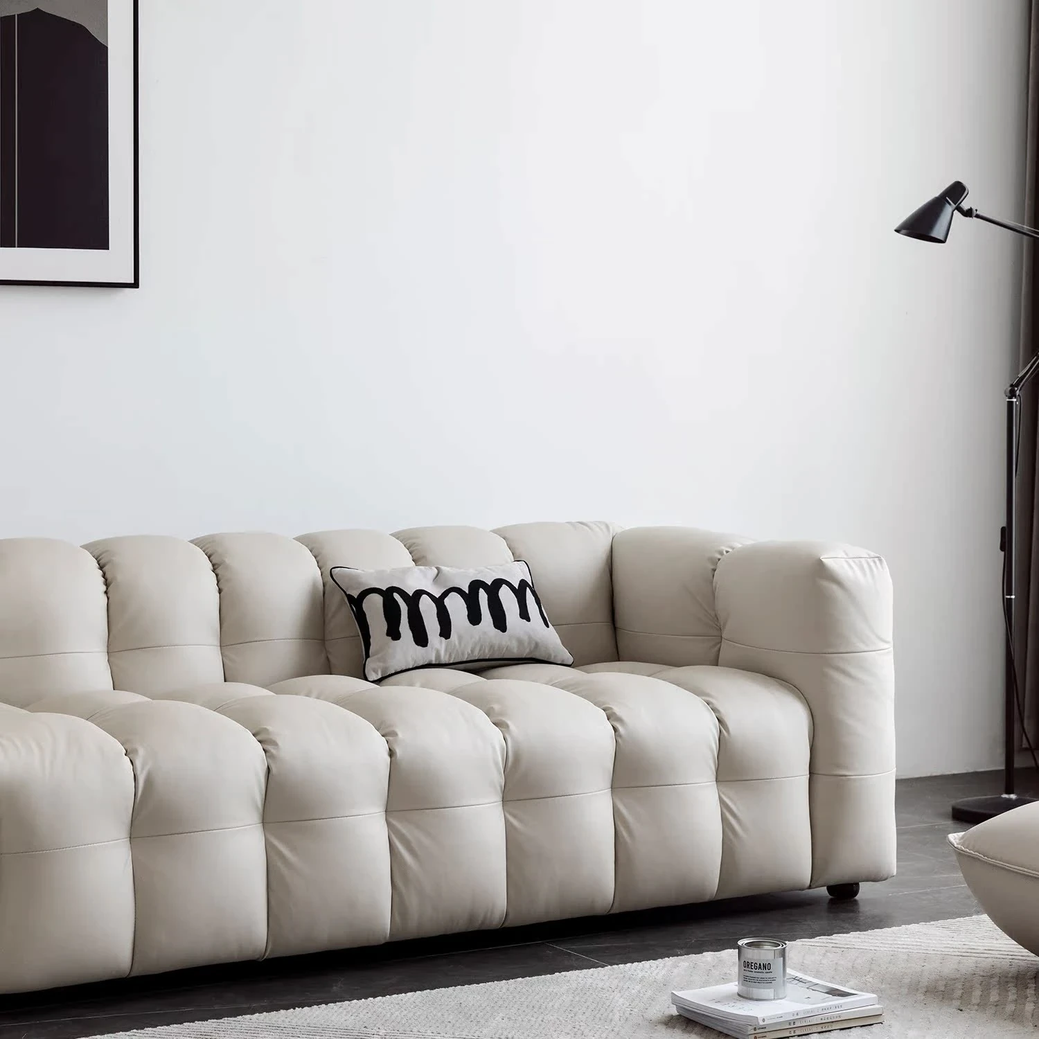 Potato Nest: Creamy White Boba Fabric Sofa for Three, Minimalist Tofu-Block Design; Black Leather Armchair for One – Perfect Blend of Comfort and Style!