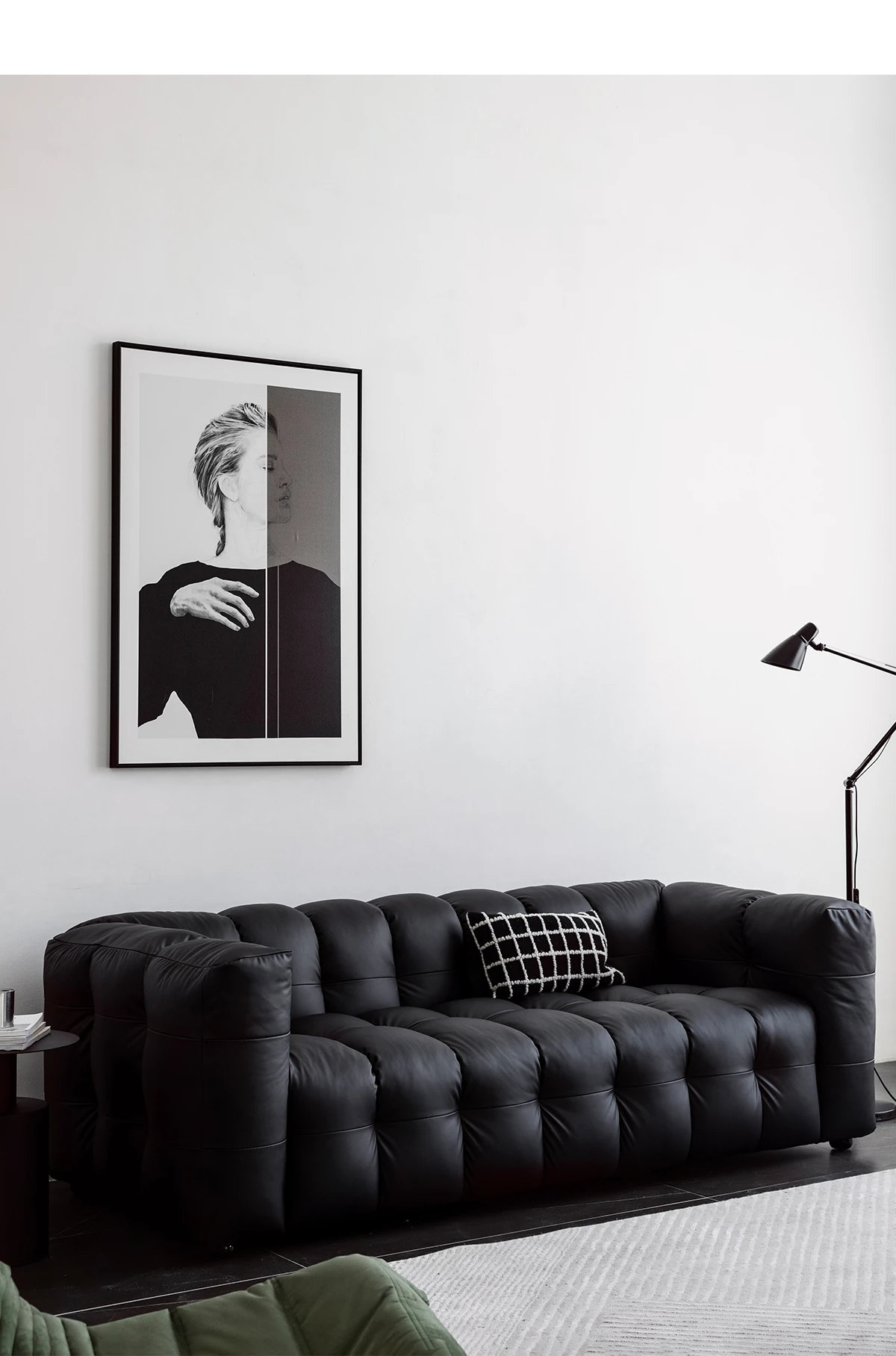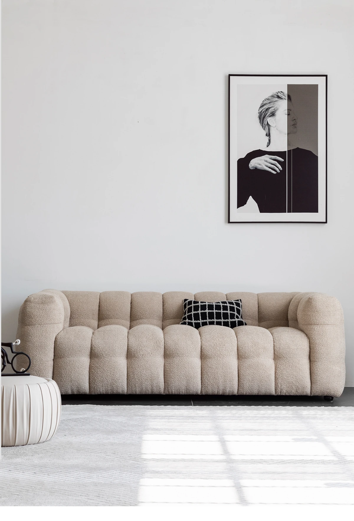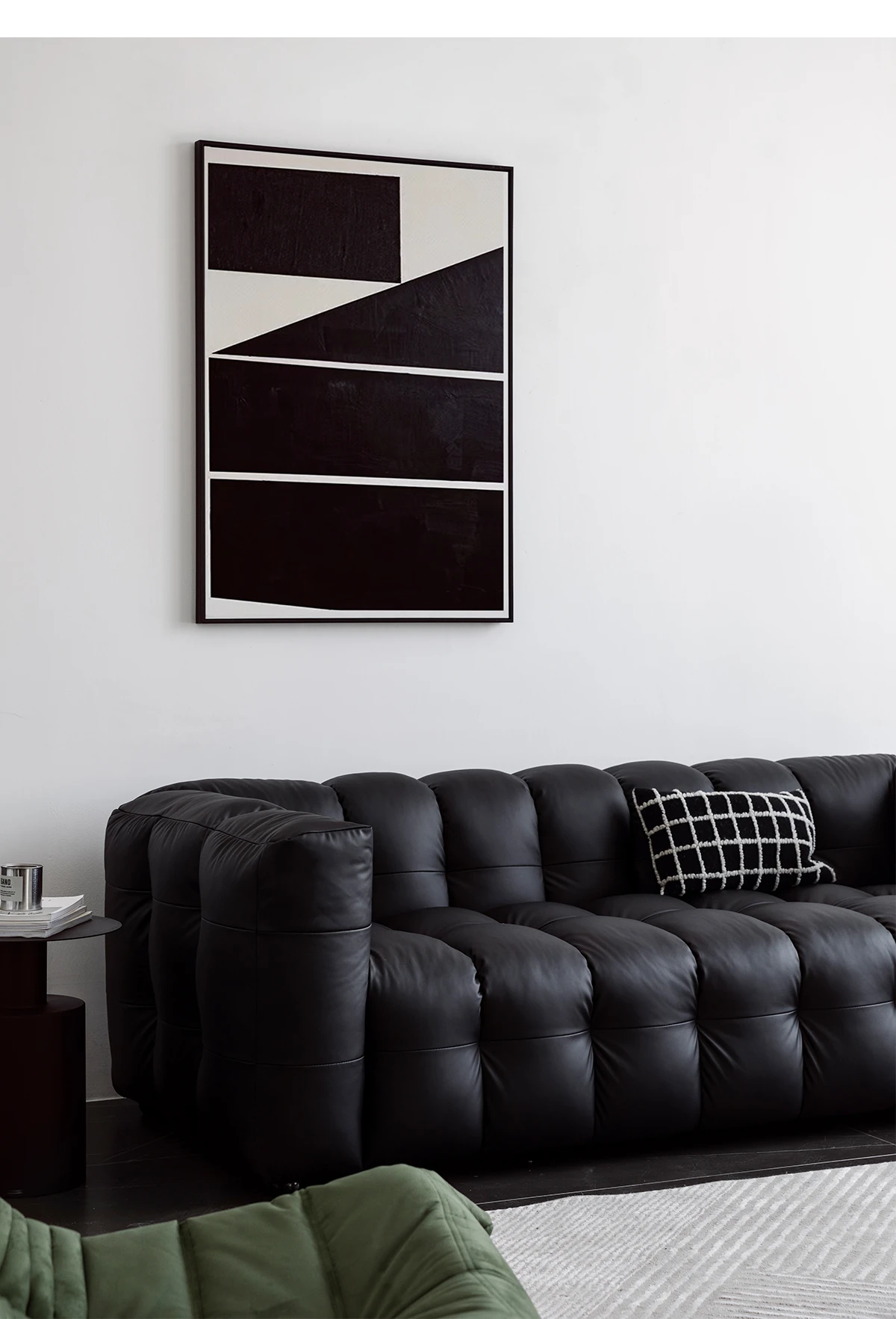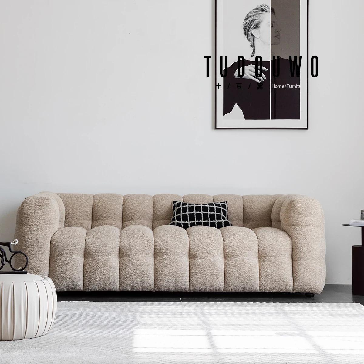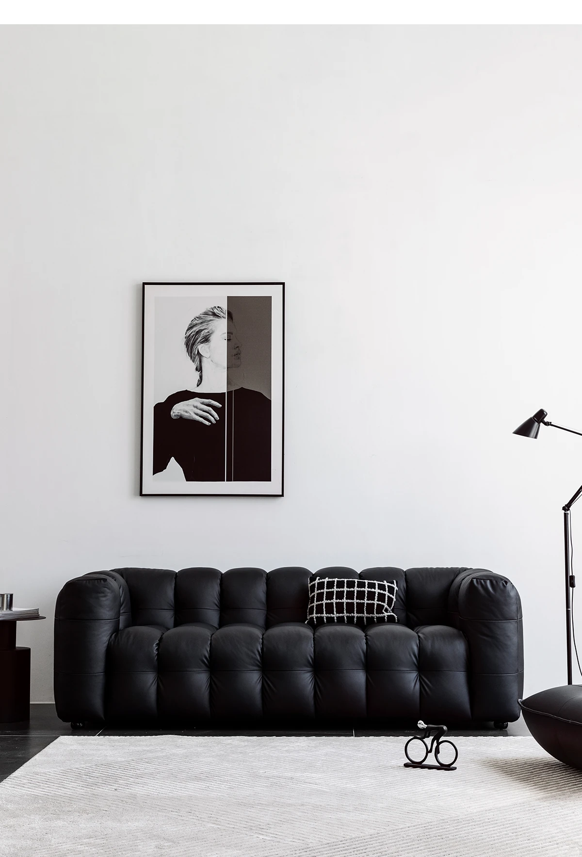 Potato Nest: Creamy White Boba Fabric Sofa for Three, Minimalist Tofu-Block Design; Black Leather Armchair for One – Perfect Blend of Comfort and Style!