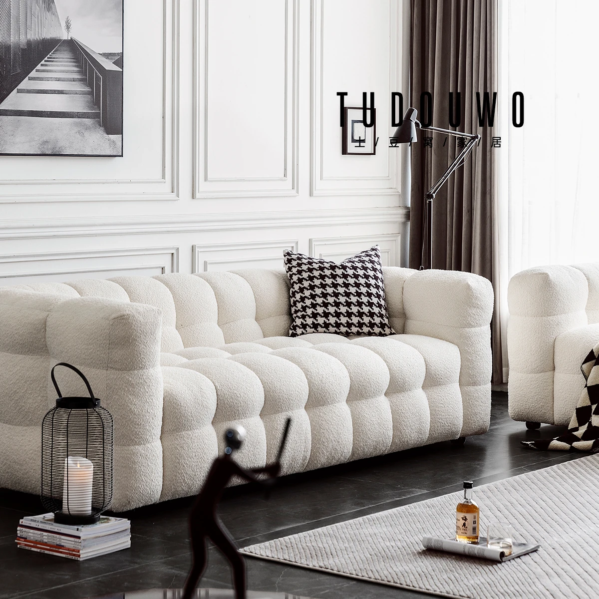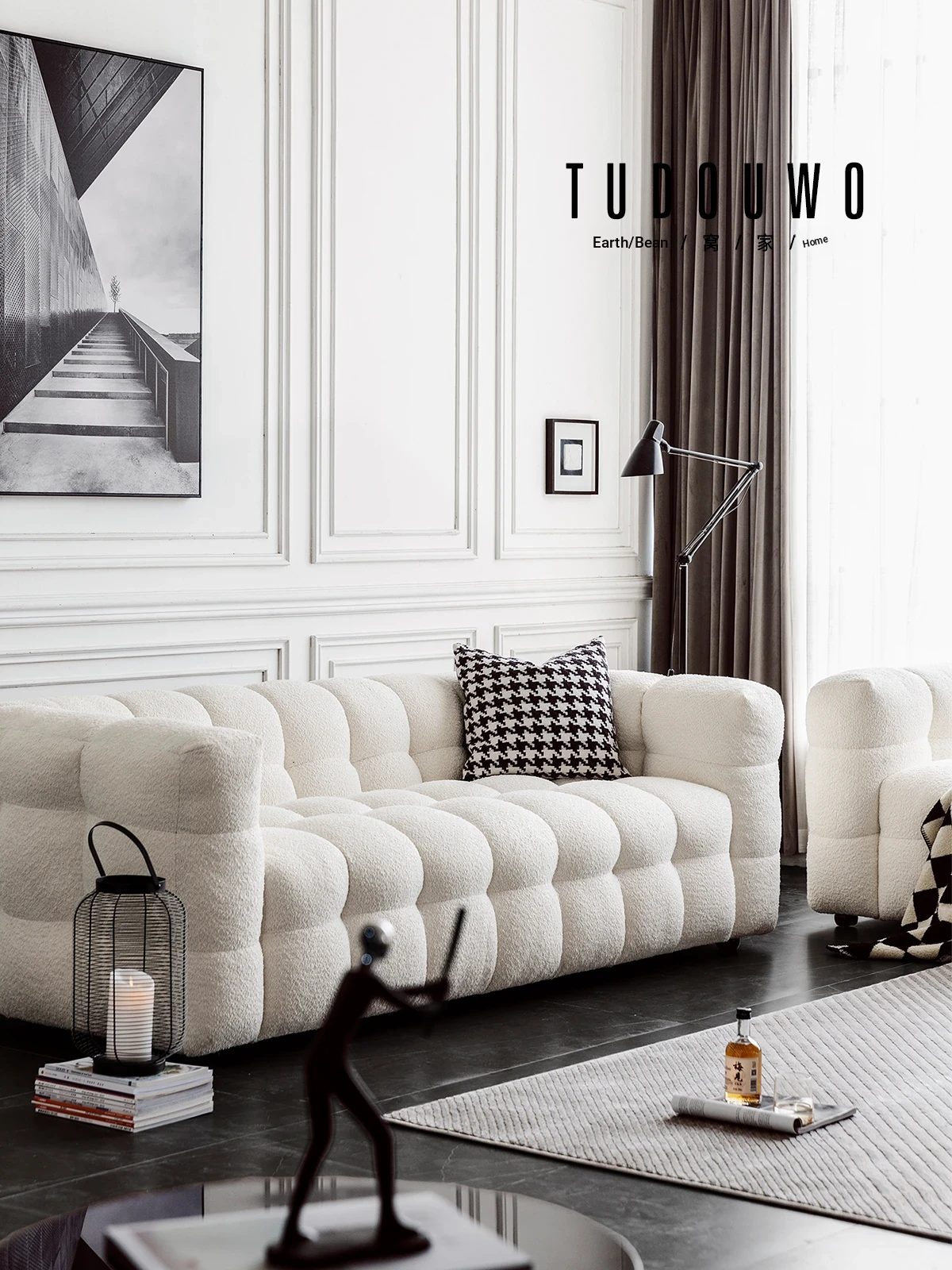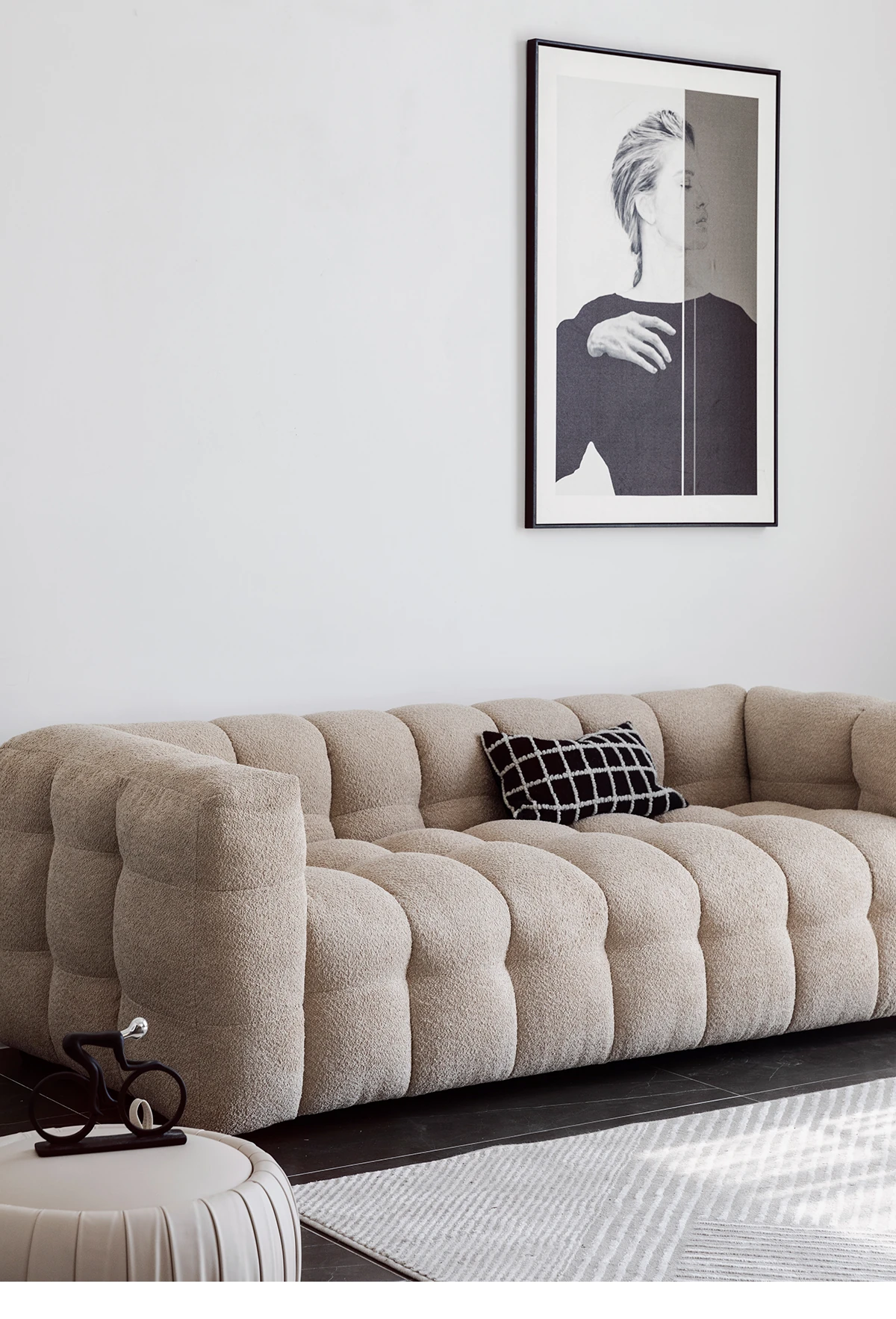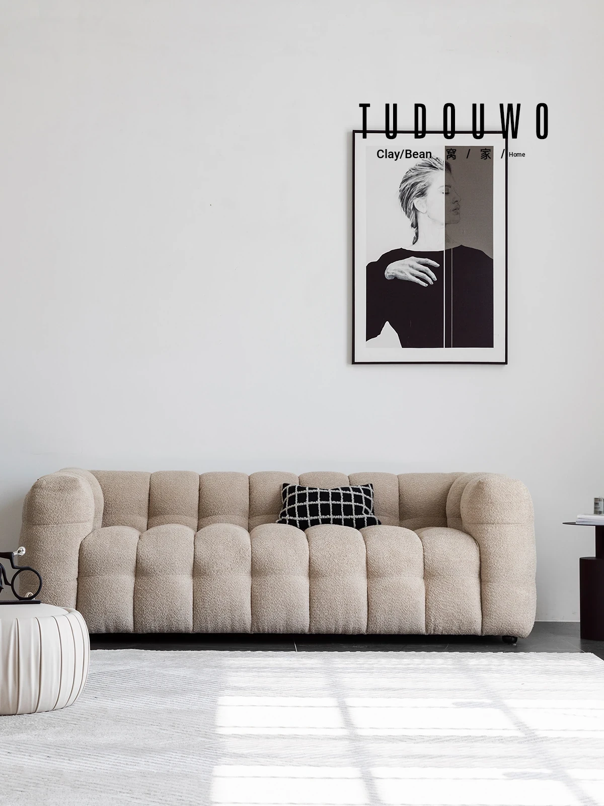 Potato Nest: Creamy White Boba Fabric Sofa for Three, Minimalist Tofu-Block Design; Black Leather Armchair for One – Perfect Blend of Comfort and Style!