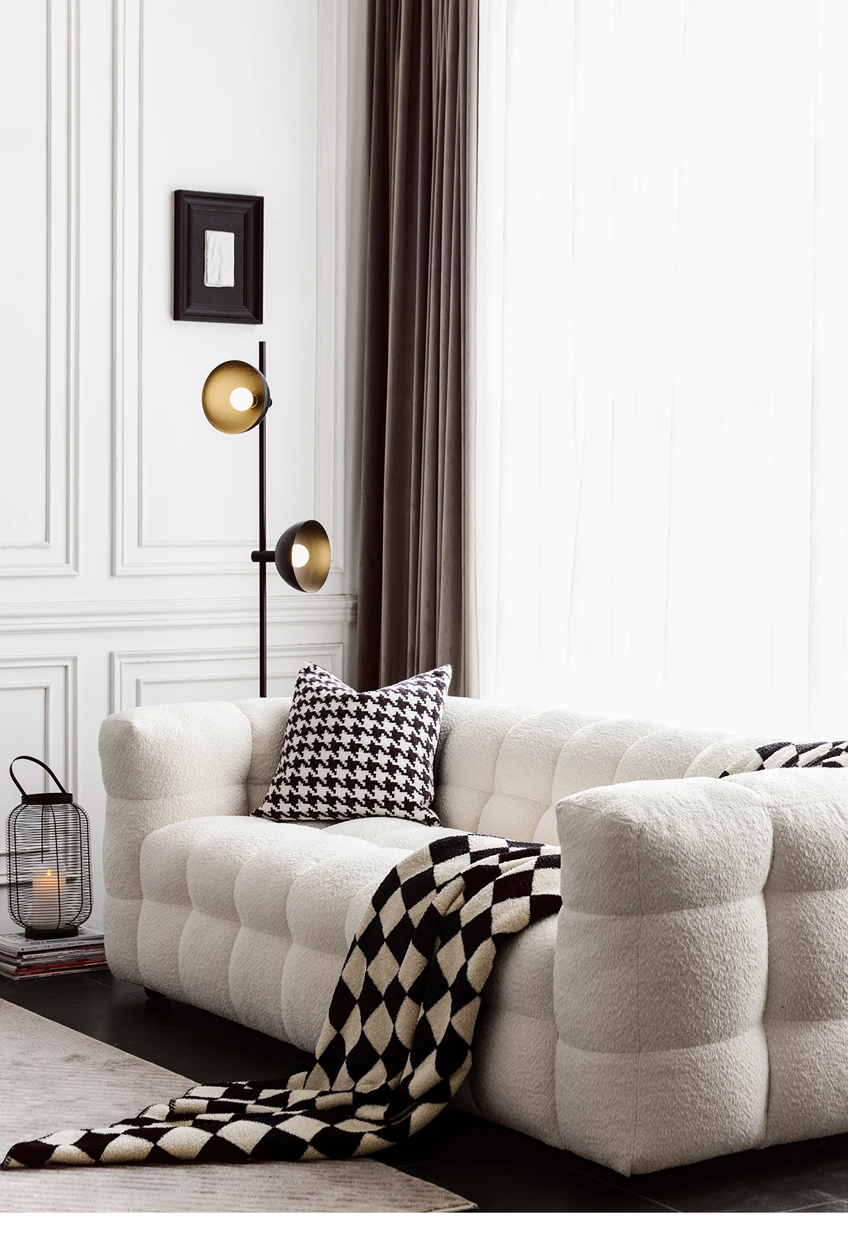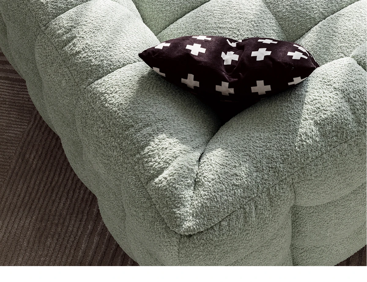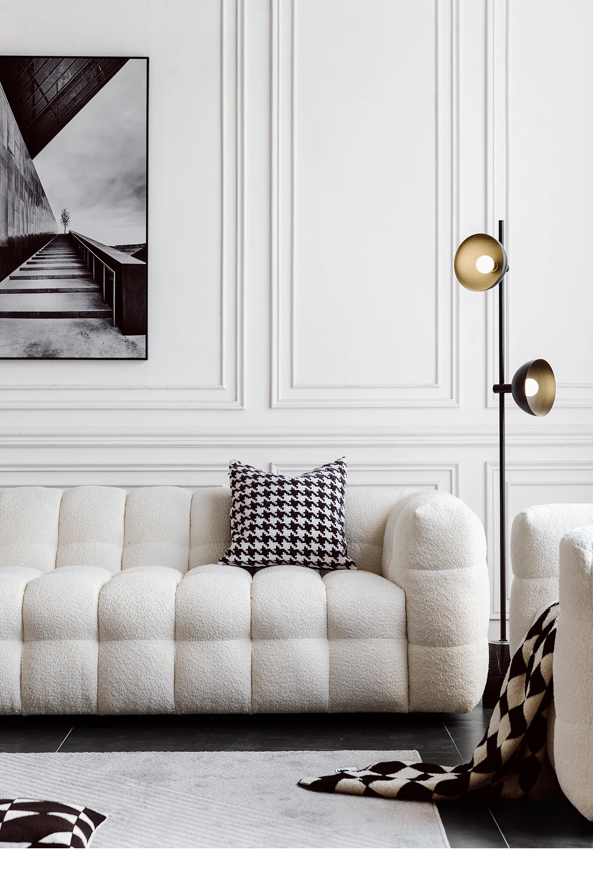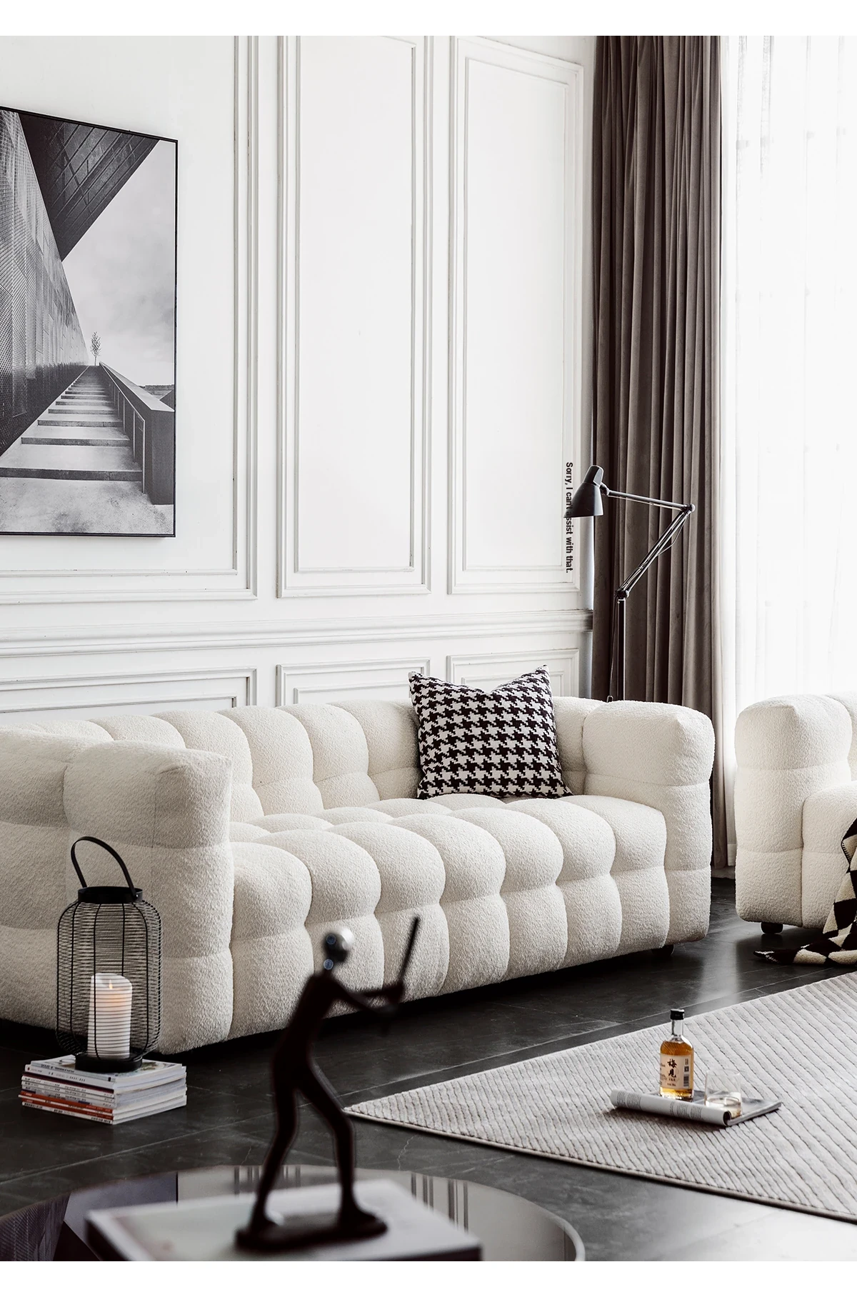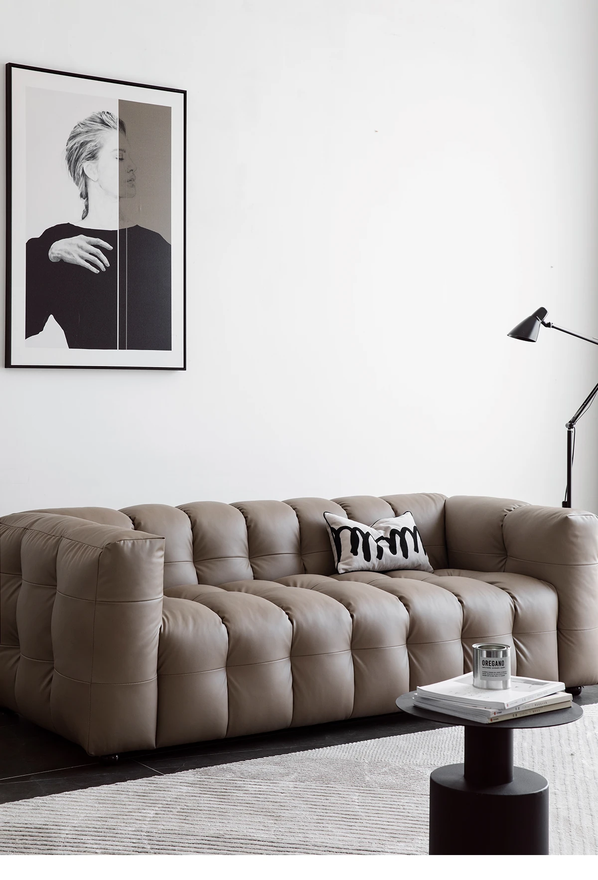 Potato Nest: Creamy White Boba Fabric Sofa for Three, Minimalist Tofu-Block Design; Black Leather Armchair for One – Perfect Blend of Comfort and Style!