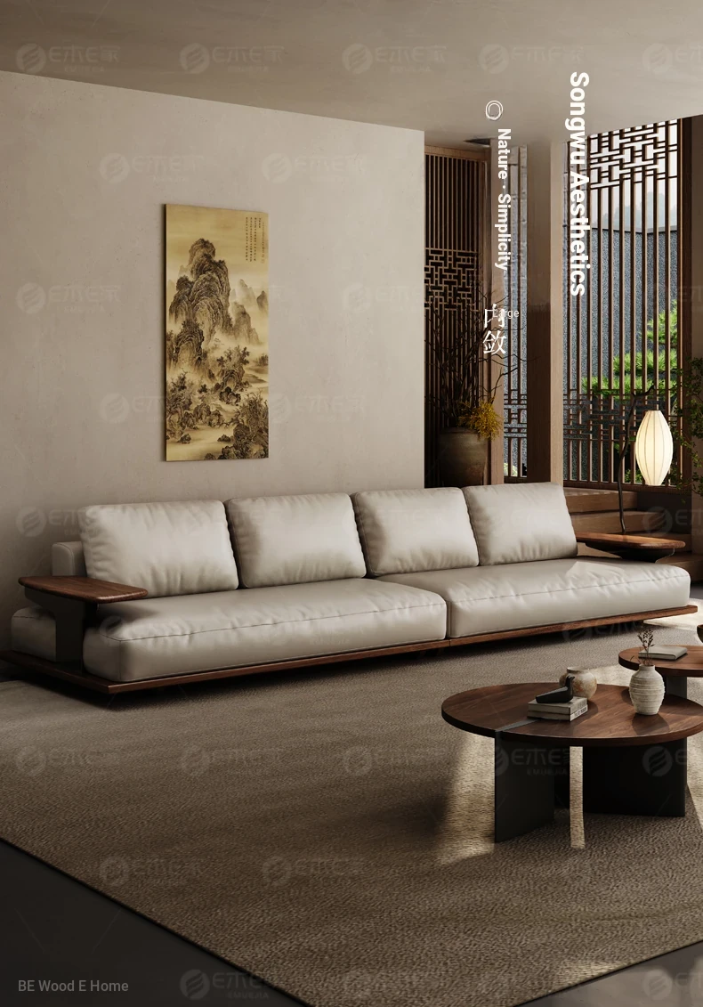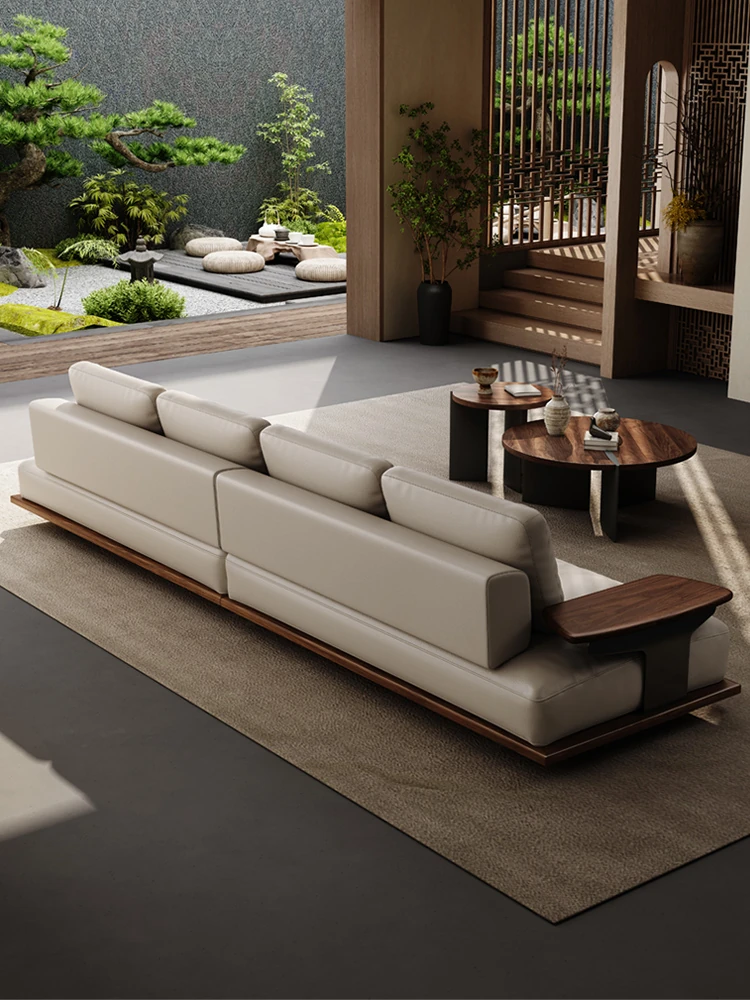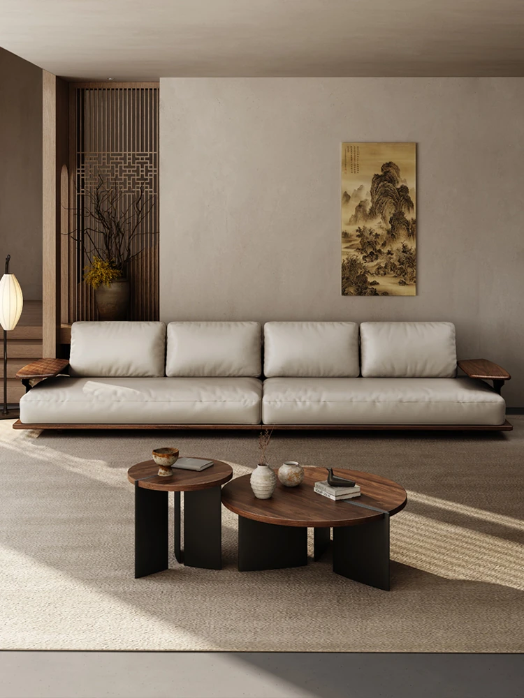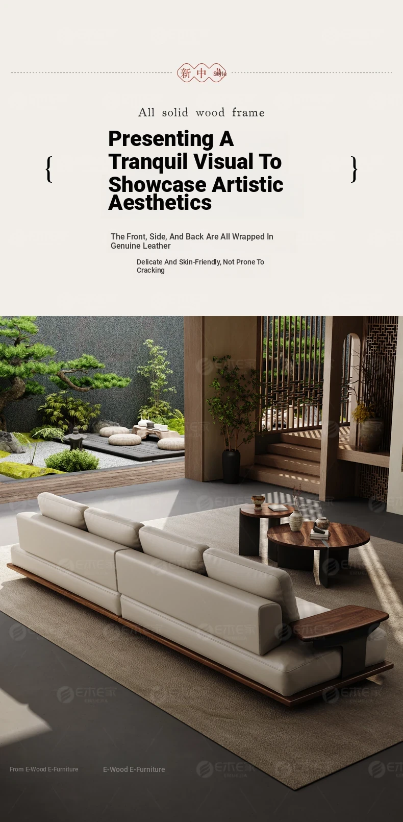 Walnut Solid Wood Leather Sofa - New Chinese Style Aesthetic with Top-Grain Cowhide for Small Living Rooms, Perfect for Modern Spaces