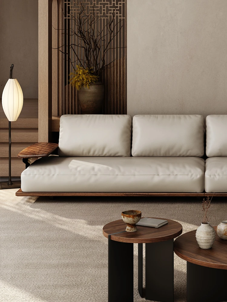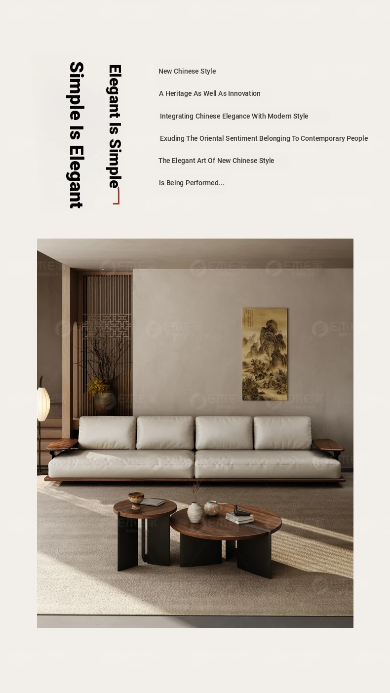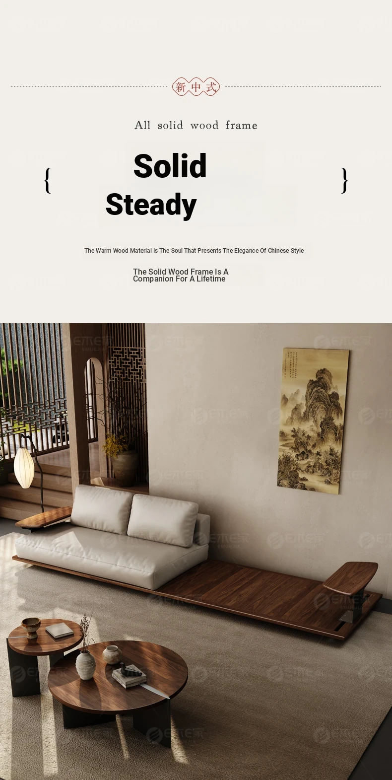 Walnut Solid Wood Leather Sofa - New Chinese Style Aesthetic with Top-Grain Cowhide for Small Living Rooms, Perfect for Modern Spaces