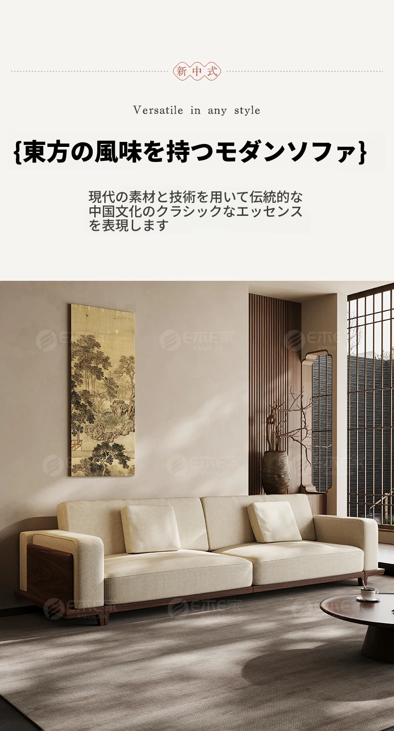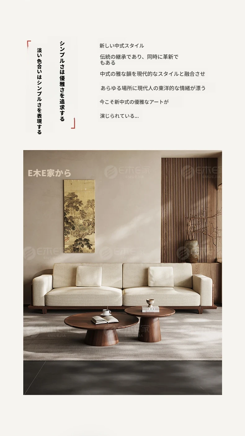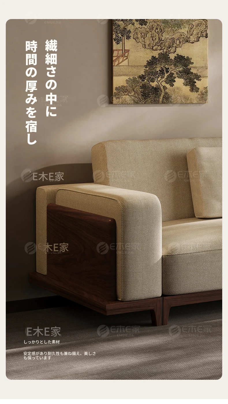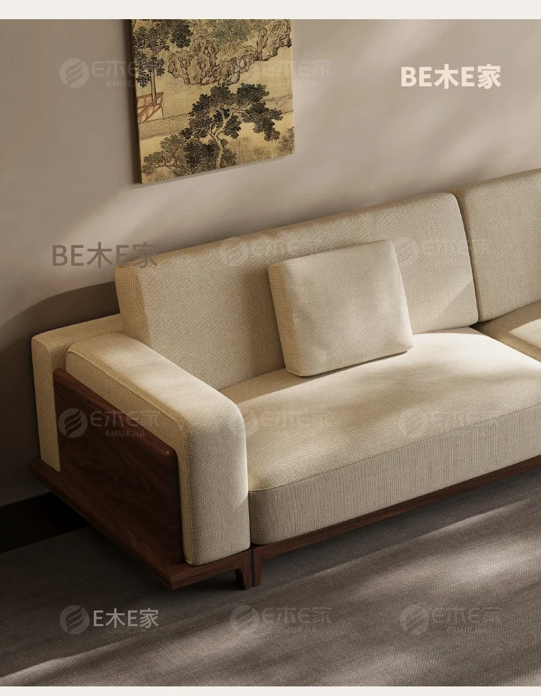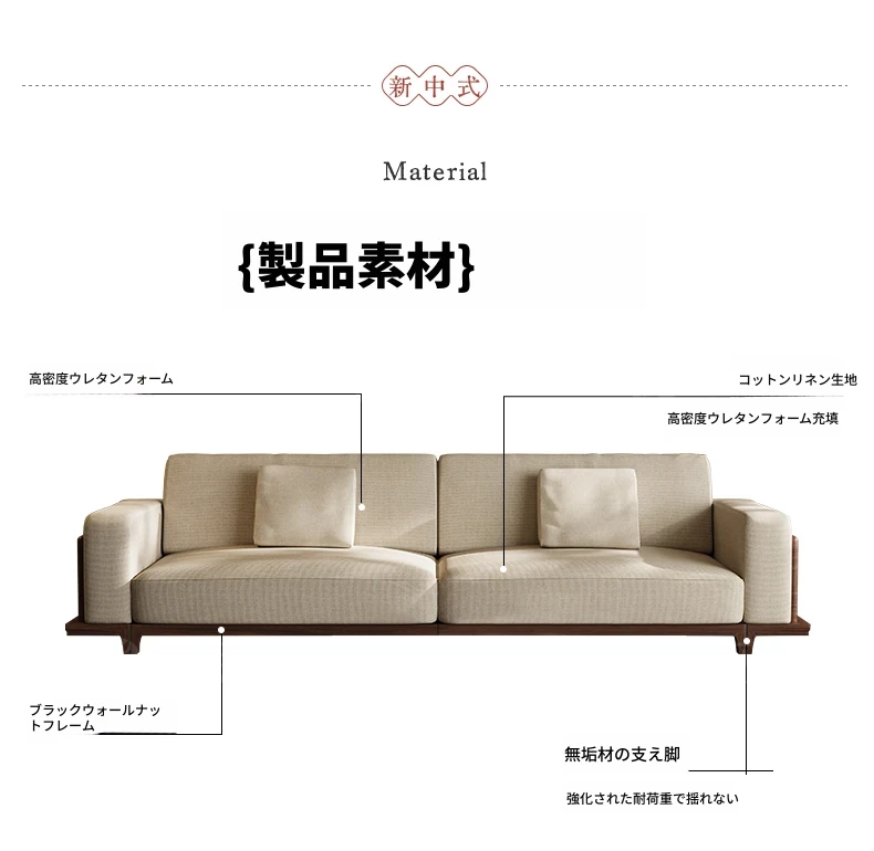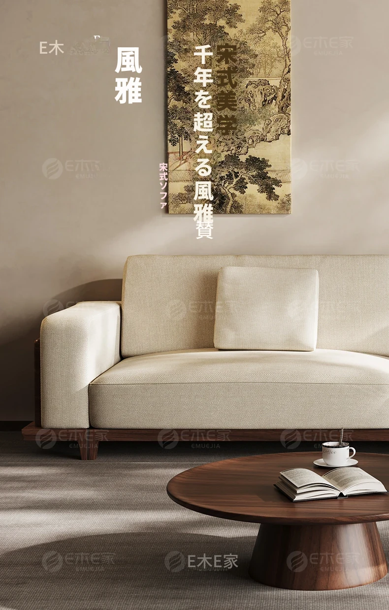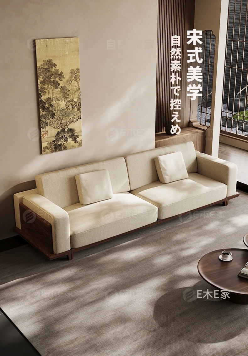 宋風美学のブラックウォールナット製コットンリネンソファー - Zenスタイルの直線デザイン、4人掛けの新中式ソファー、2025年新作登場!心安らぐひとときを提供します。