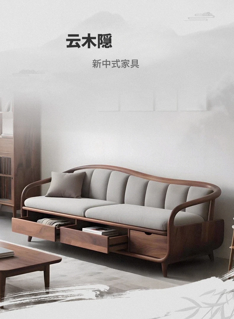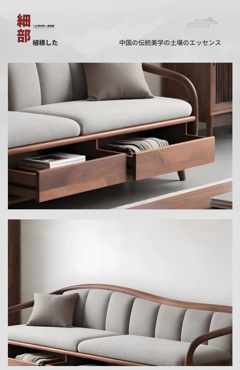 2025年新作!高級感あふれる新中式無垢材ソファ - ブラックウォールナットの優雅なデザイン、別荘リビングにぴったり!収納機能付きで、おしゃれさと実用性を兼ね備えた一品です。