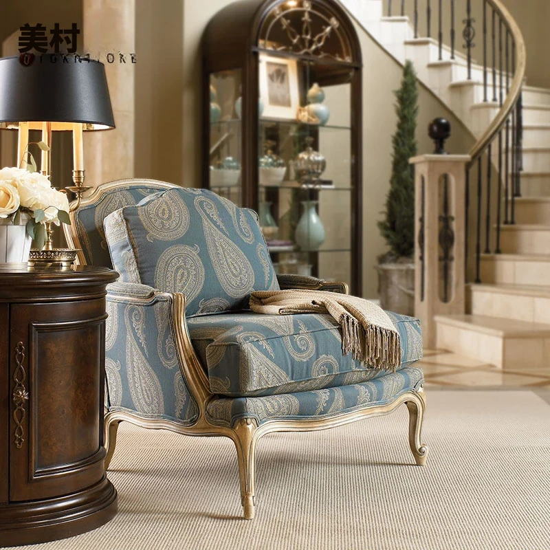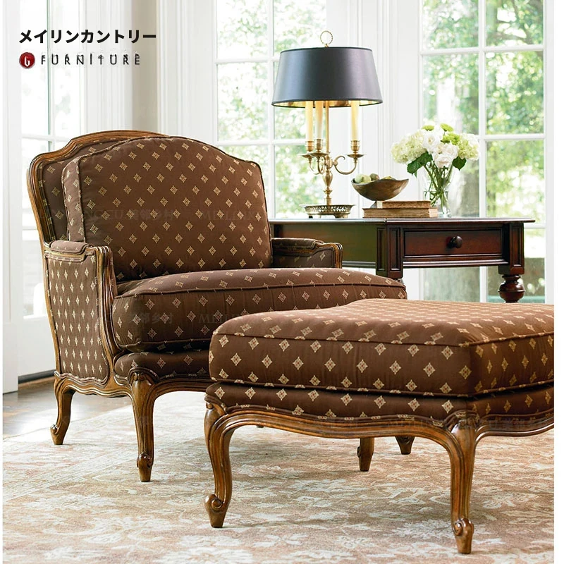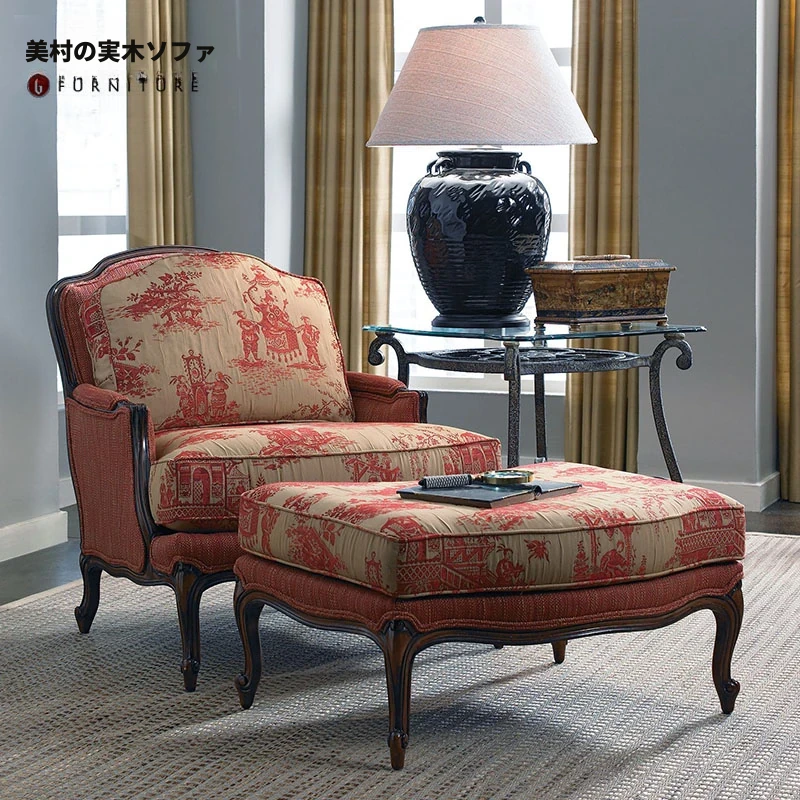 アメリカンスタイルのヴィンテージ全木製布張りソフトパッケージ1人掛けソファ&フットスツールセット - 快適でおしゃれなデザイン、自宅にぴったりの柔らかい花柄ソファチェア!
