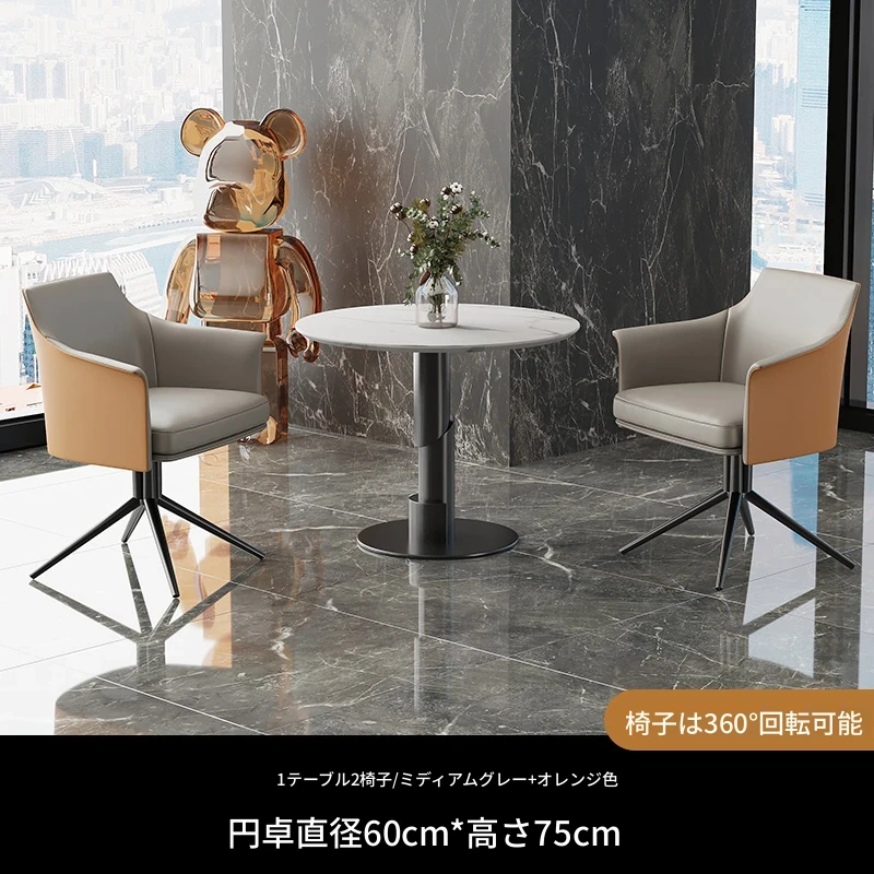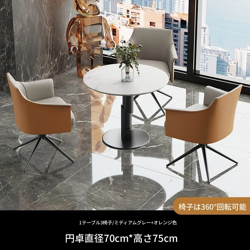 1テーブル3椅子:米グレー+オレンジ/西皮/回転付き + 円テーブル:70*75cm【雪山ホワイト天板】