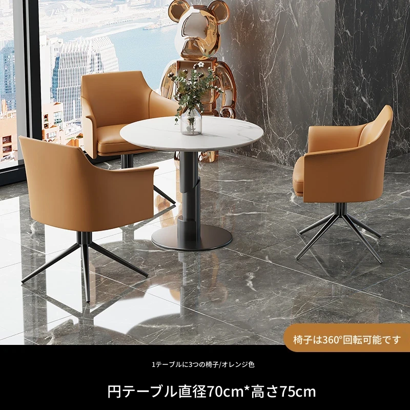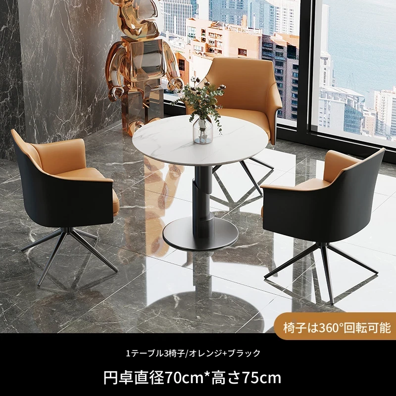 1テーブル3椅子:オレンジ+黒/西皮/回転付き + 円テーブル:70*75cm【雪山ホワイト天板】