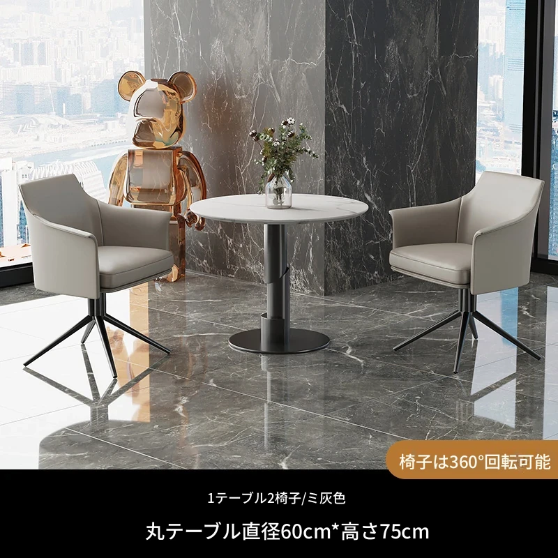 1テーブル2椅子:米グレー/西皮/回転付き + 円テーブル:60*75cm【雪山ホワイト天板】