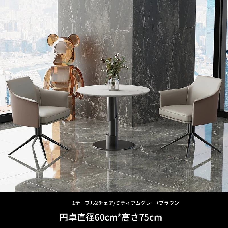 1テーブル2椅子:米グレー+ブラウン/西皮/回転付き + 円テーブル:60*75cm【雪山ホワイト天板】
