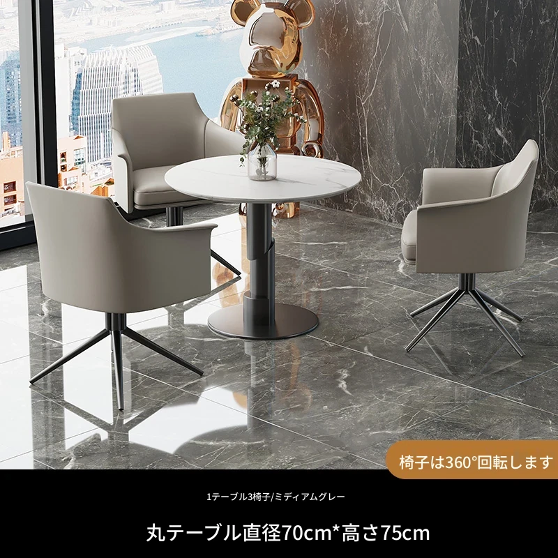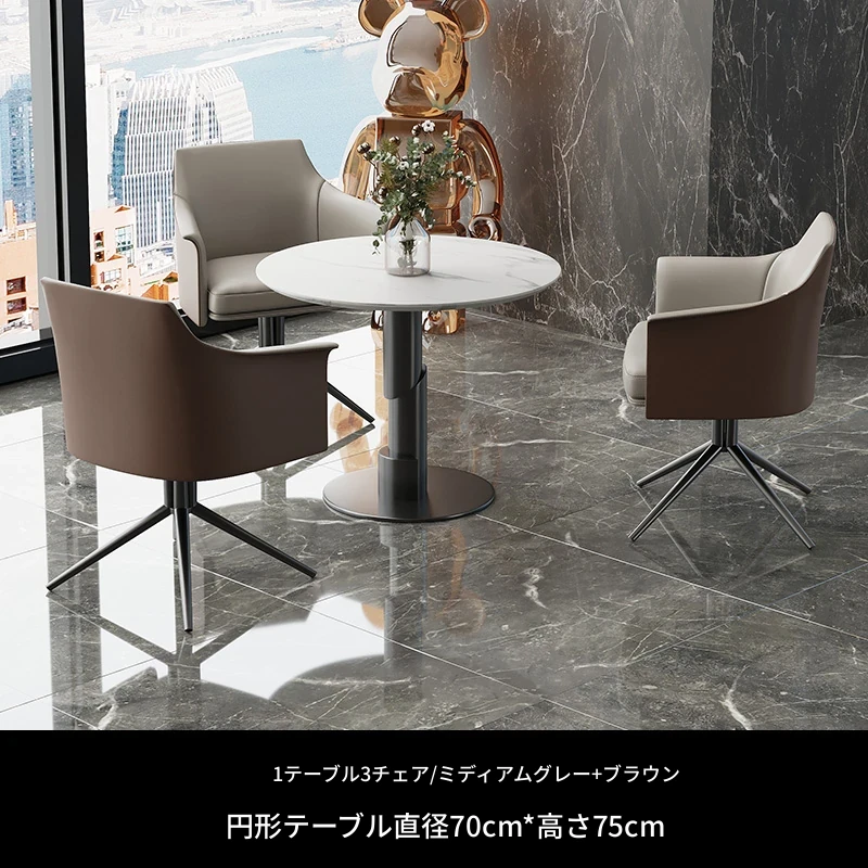1テーブル3椅子:米グレー+ブラウン/西皮/回転付き + 円テーブル:70*75cm【雪山ホワイト天板】