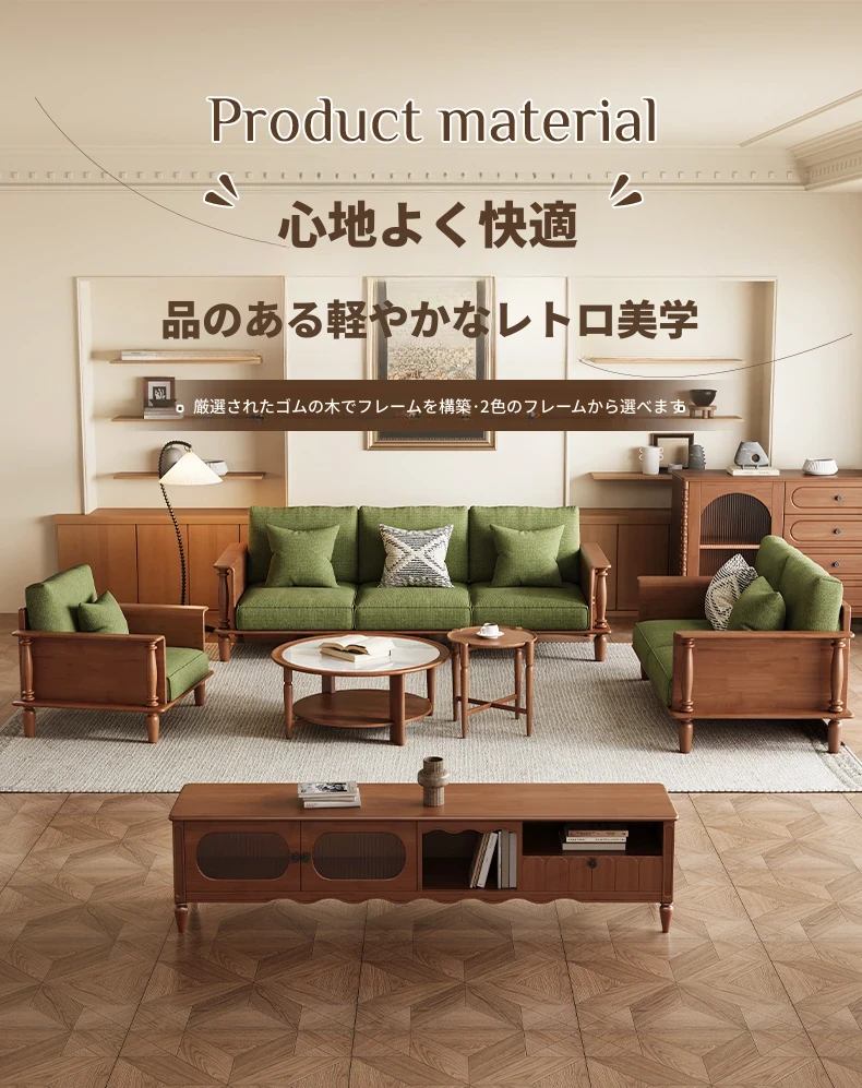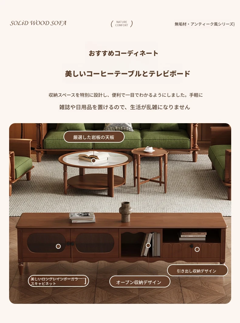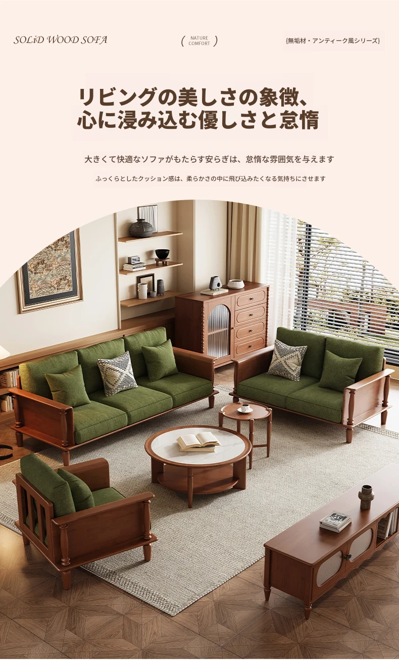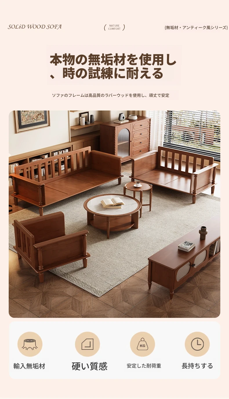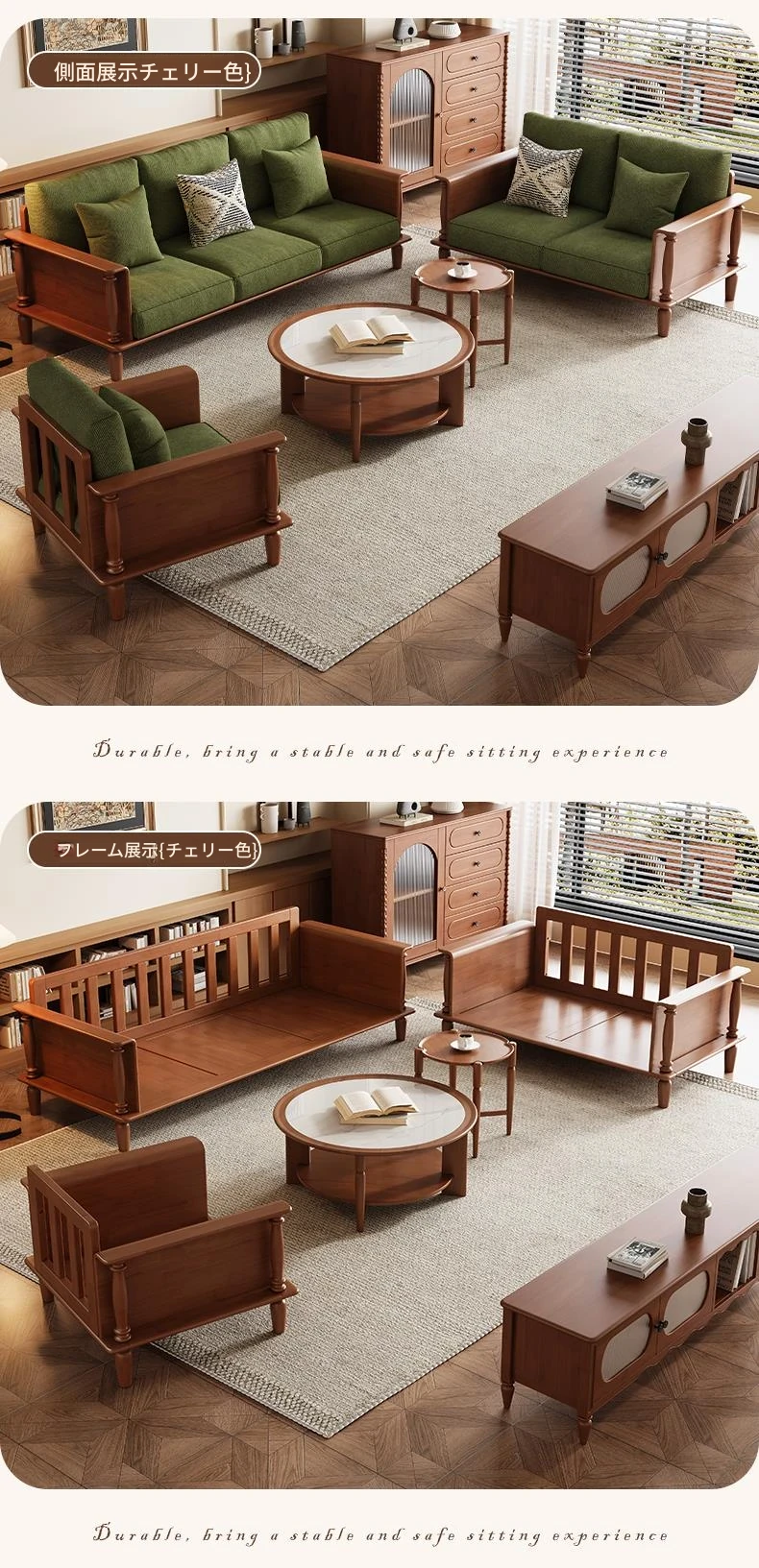 フレンチヴィンテージスタイルの無垢材ソファ - 小さなリビングルームにぴったりな布製ソファ、コーヒーテーブル&テレビキャビネットセットで、優雅な空間を演出!