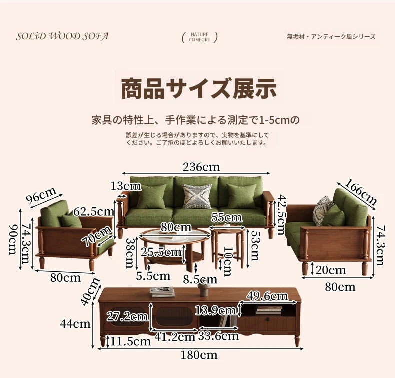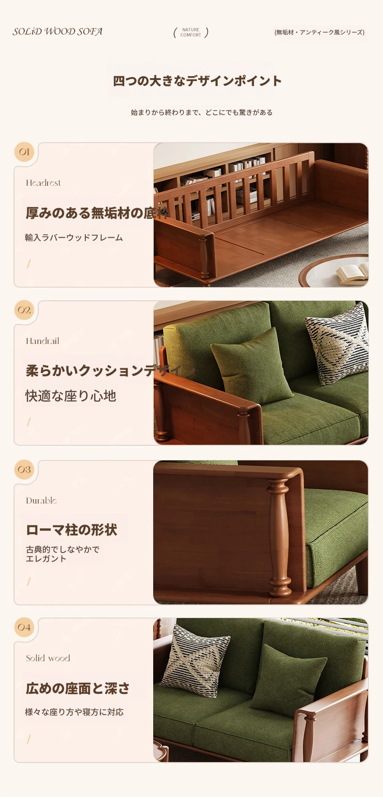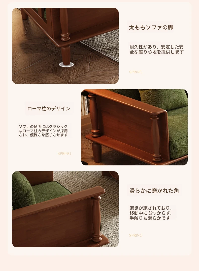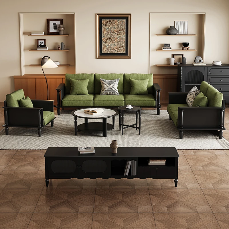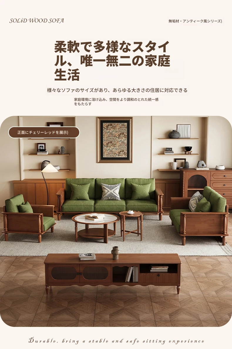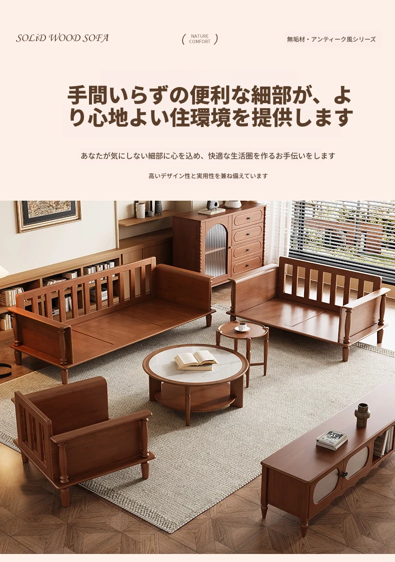 フレンチヴィンテージスタイルの無垢材ソファ - 小さなリビングルームにぴったりな布製ソファ、コーヒーテーブル&テレビキャビネットセットで、優雅な空間を演出!