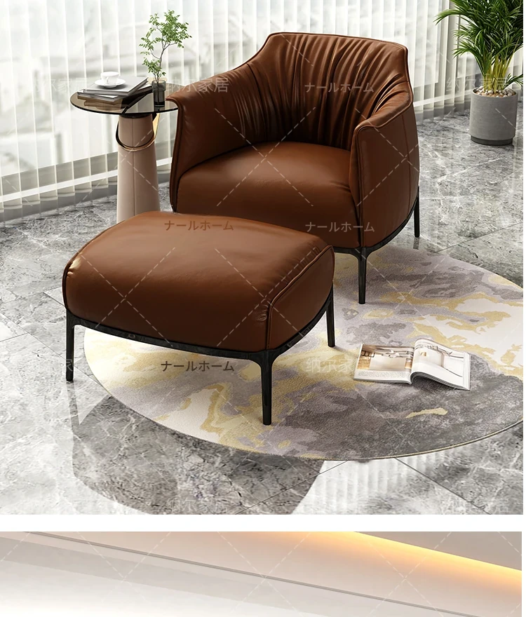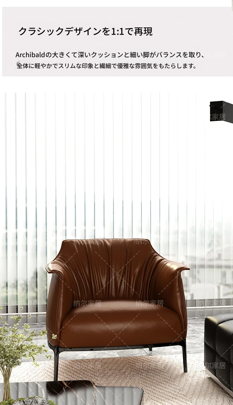 イタリアン・北欧スタイルのミニマリストデザイン、Archibald一人掛けソファ。高級本革使用で、リラックスできる洽談用チェア。おしゃれなリビングやバルコニーにぴったり!