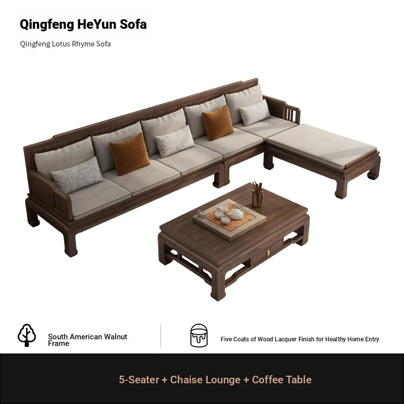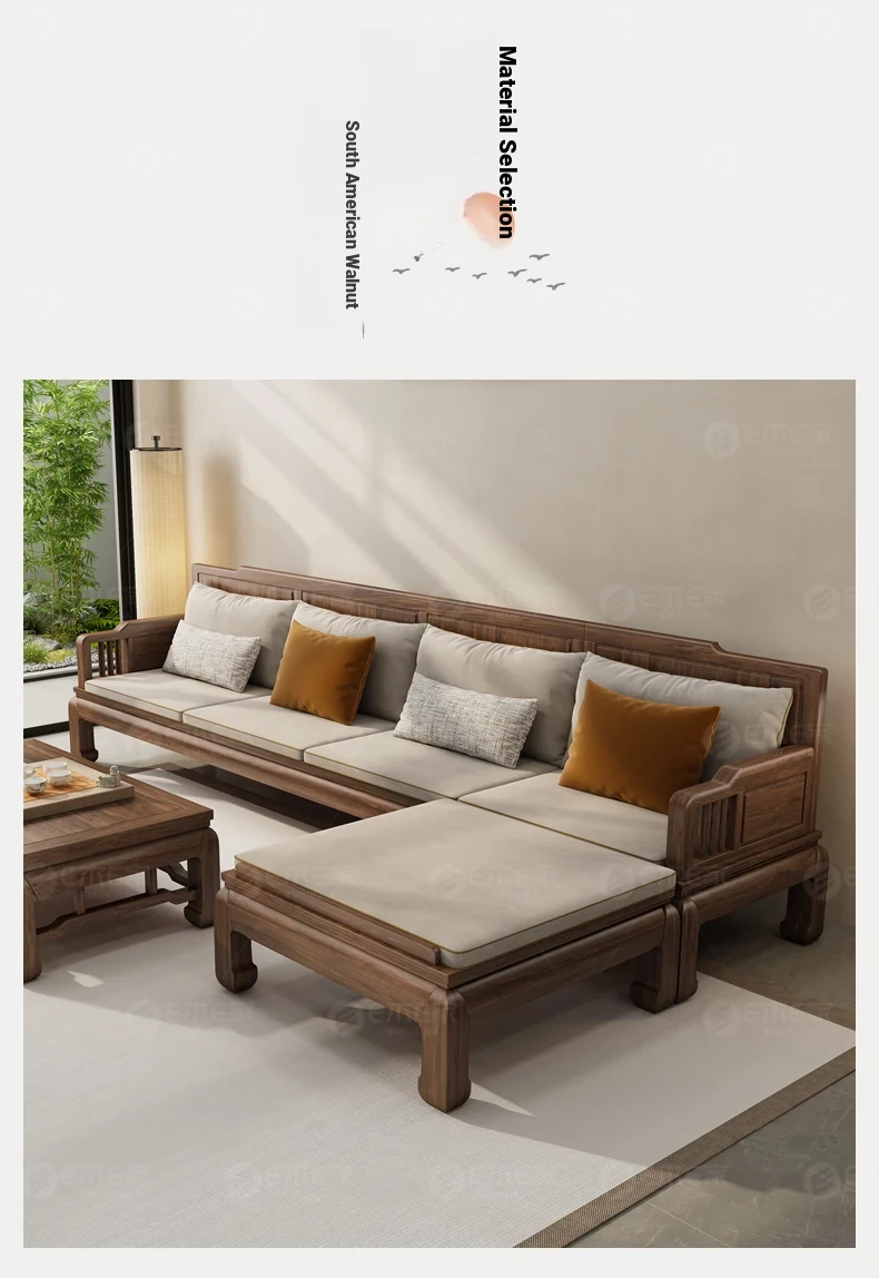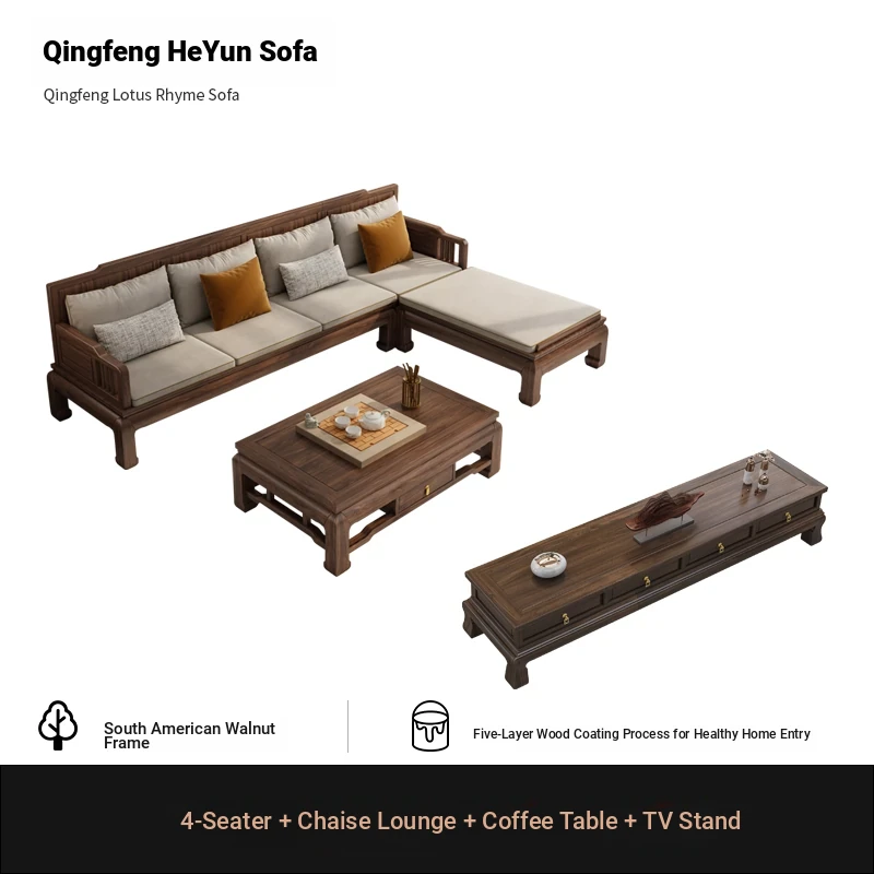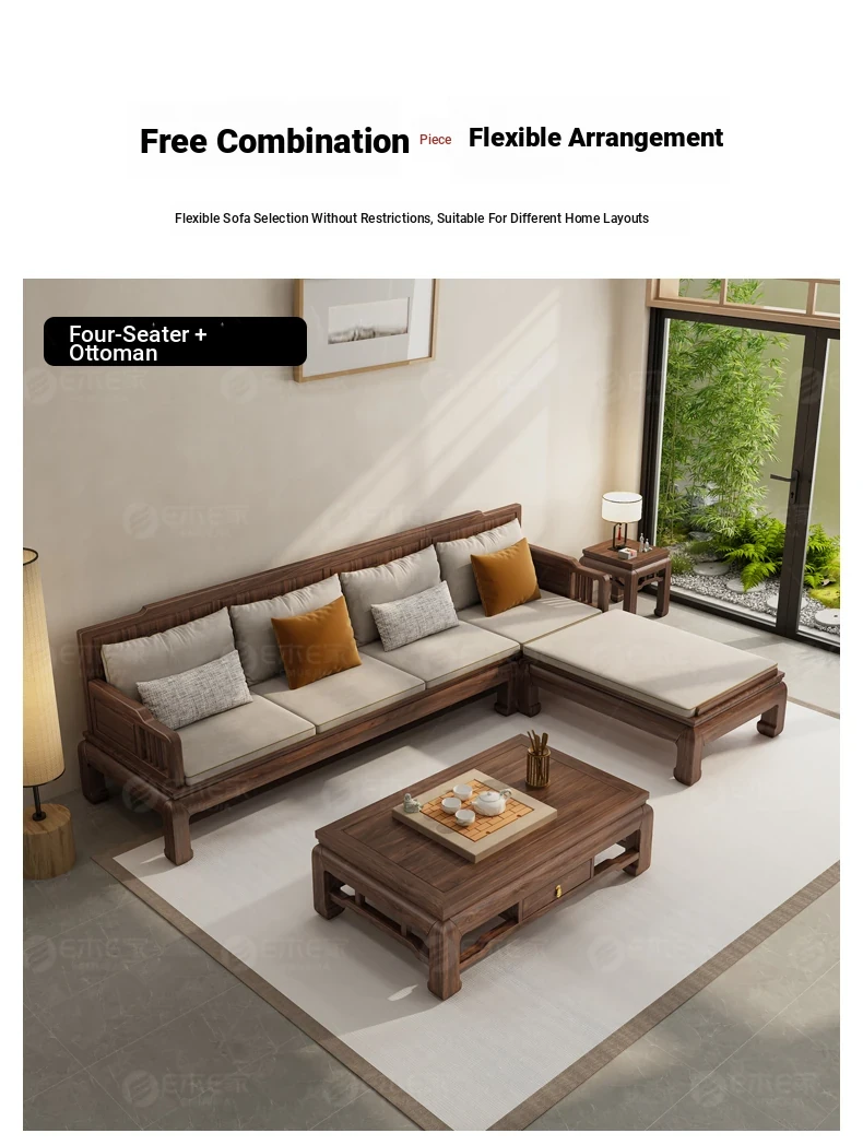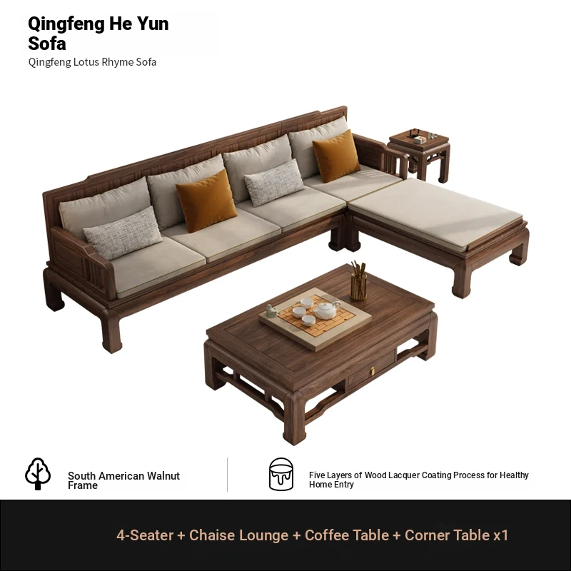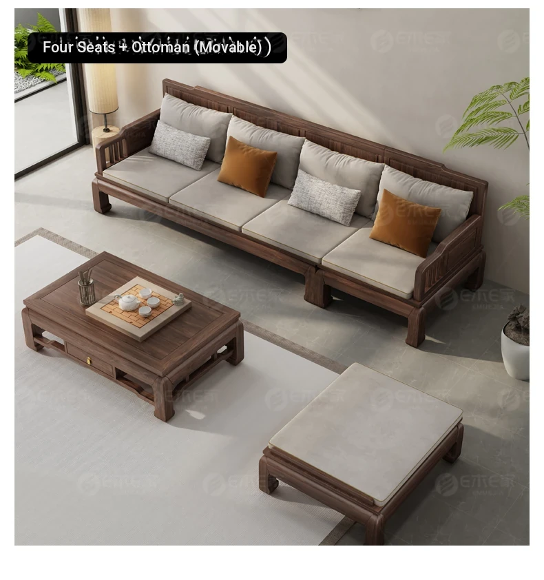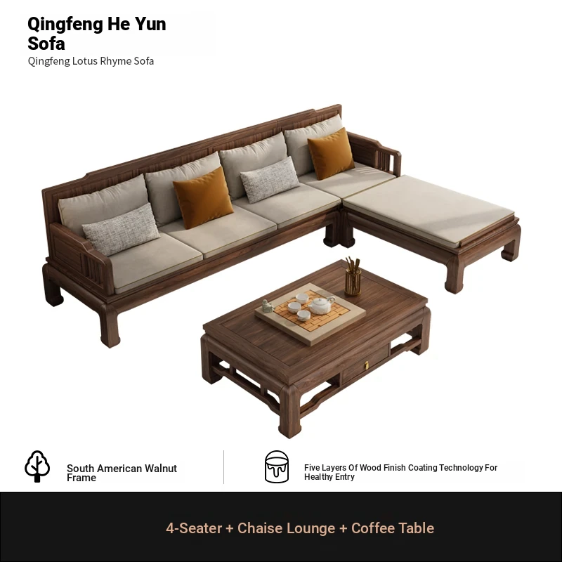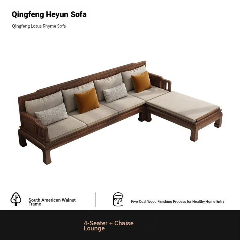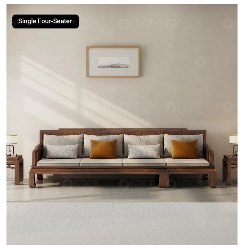 Modern Chinese Style Solid Wood Sofa Set - 4-Person Chaise Lounge Combination, Versatile for Winter and Summer, Perfect for Small Living Rooms, Walnut Wood Furniture