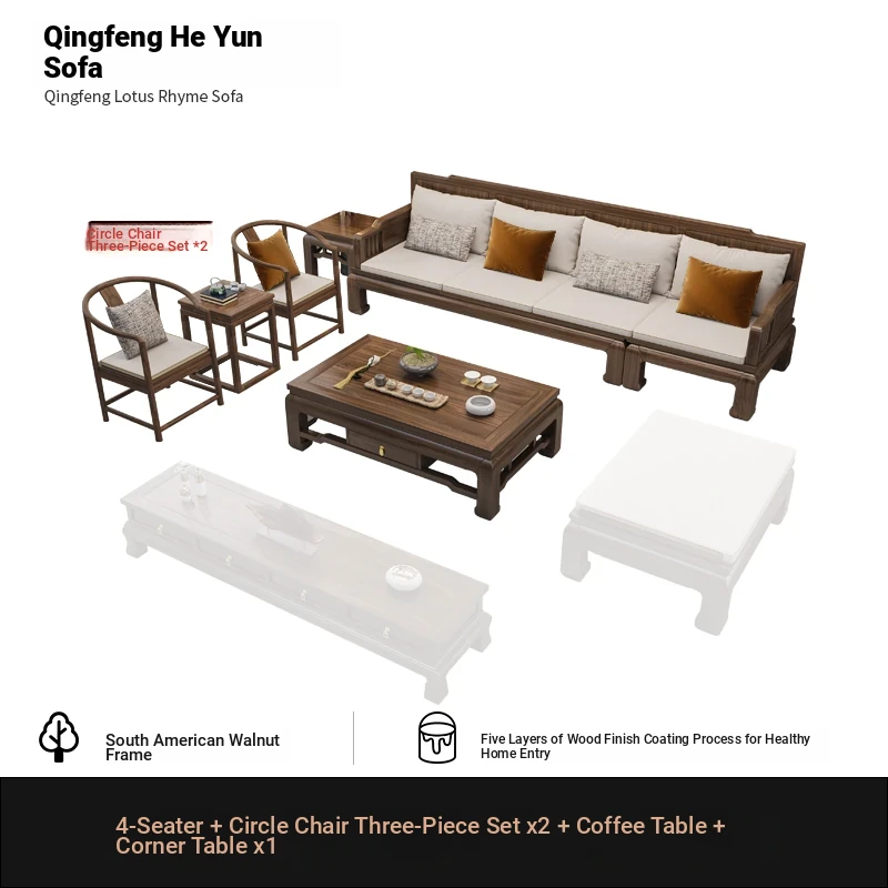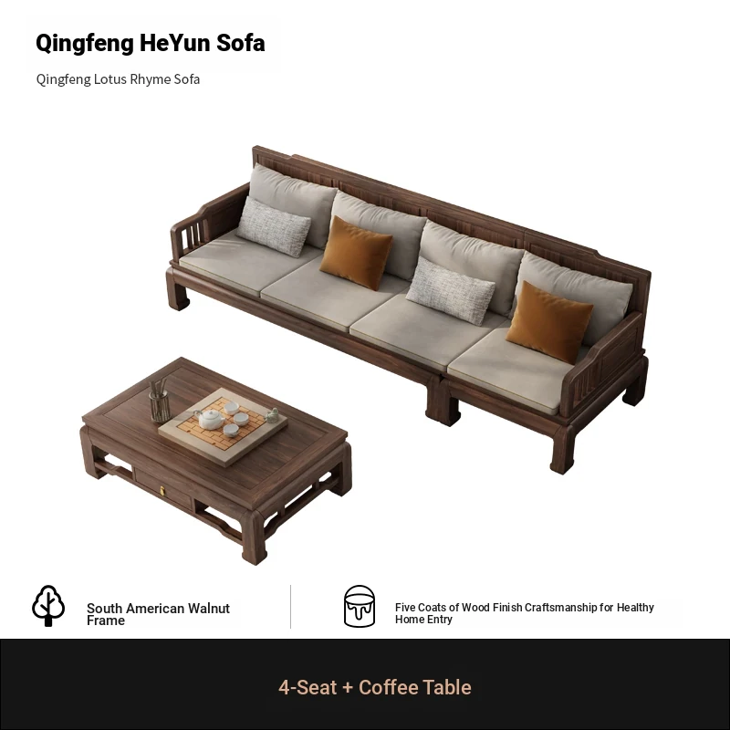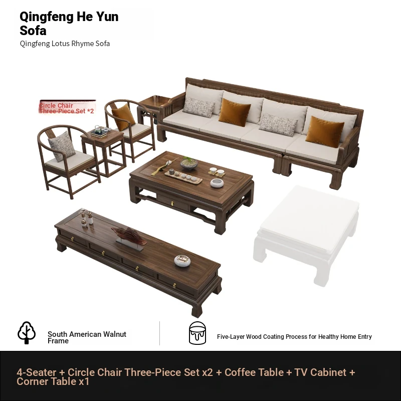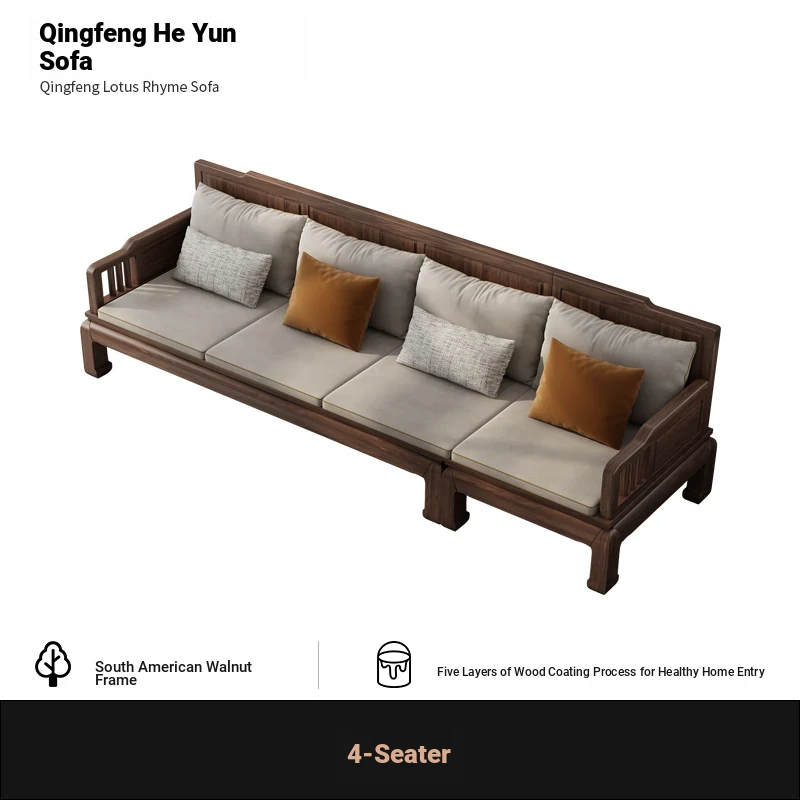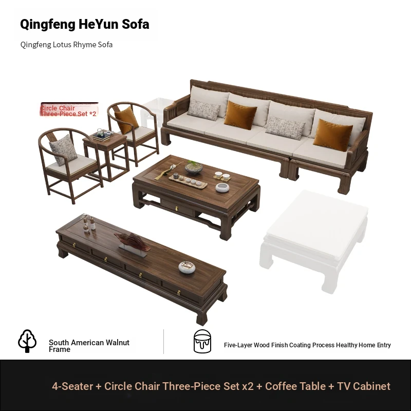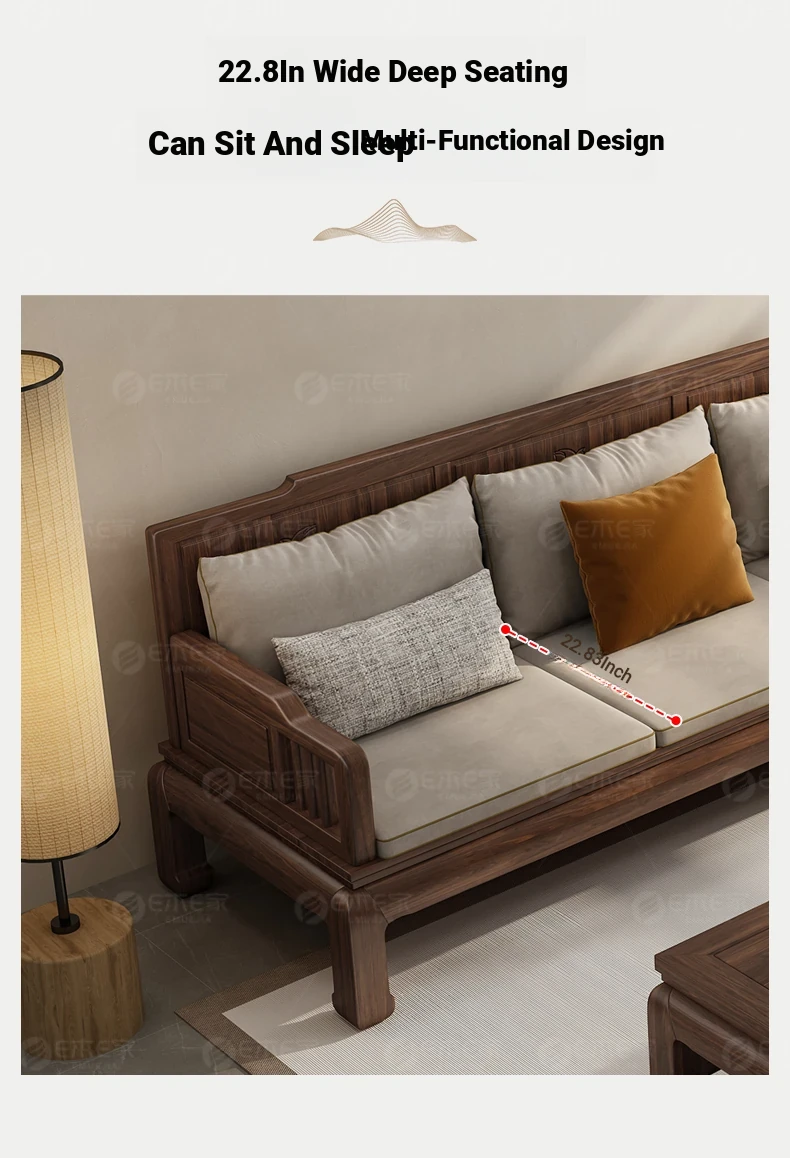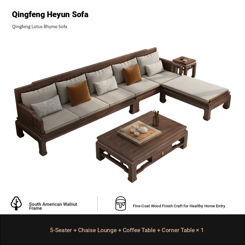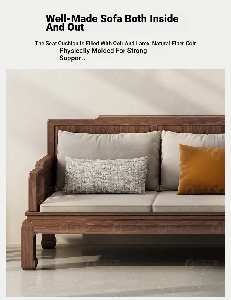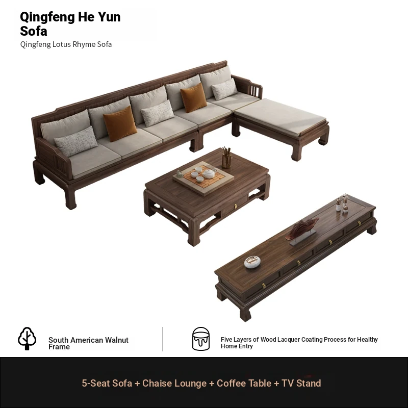 Modern Chinese Style Solid Wood Sofa Set - 4-Person Chaise Lounge Combination, Versatile for Winter and Summer, Perfect for Small Living Rooms, Walnut Wood Furniture