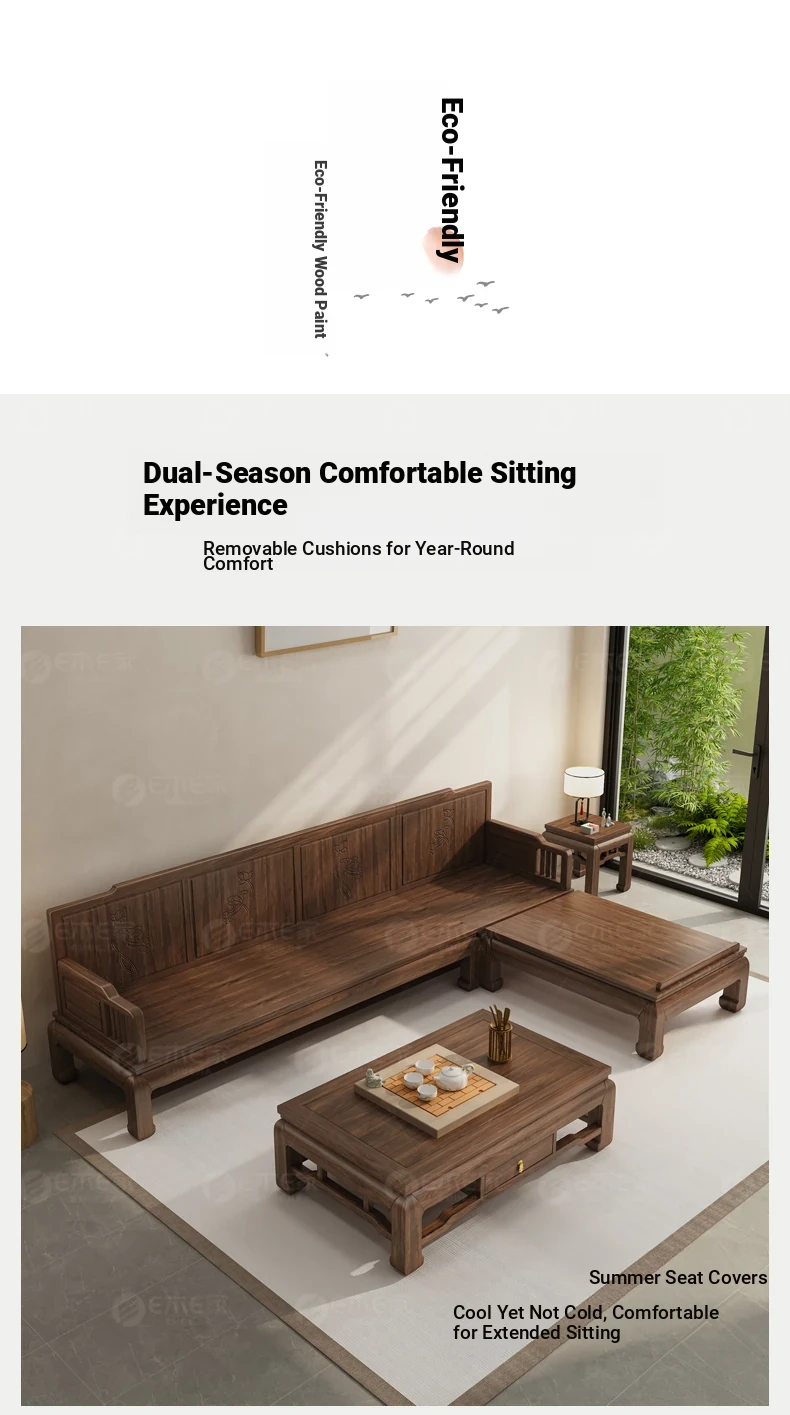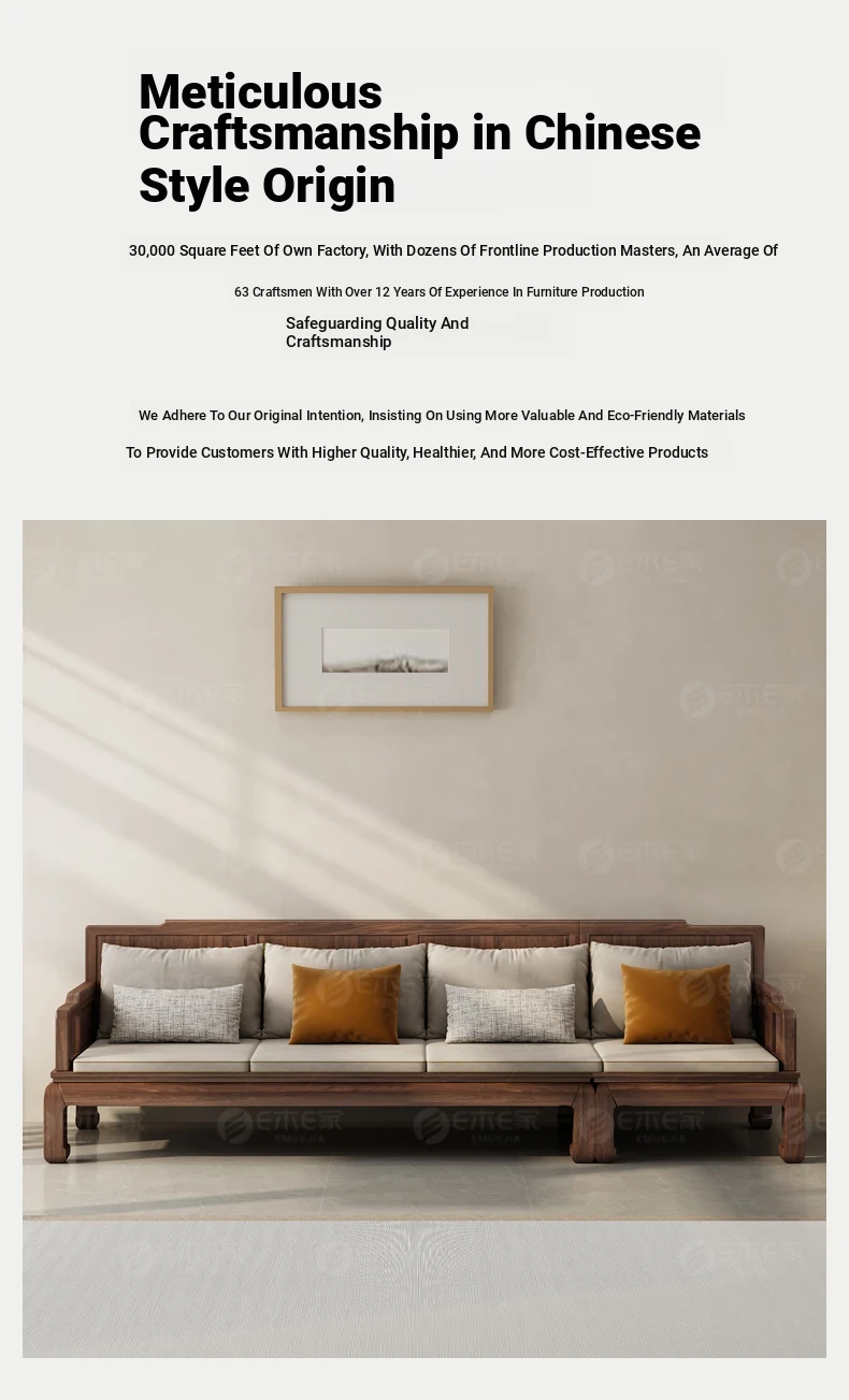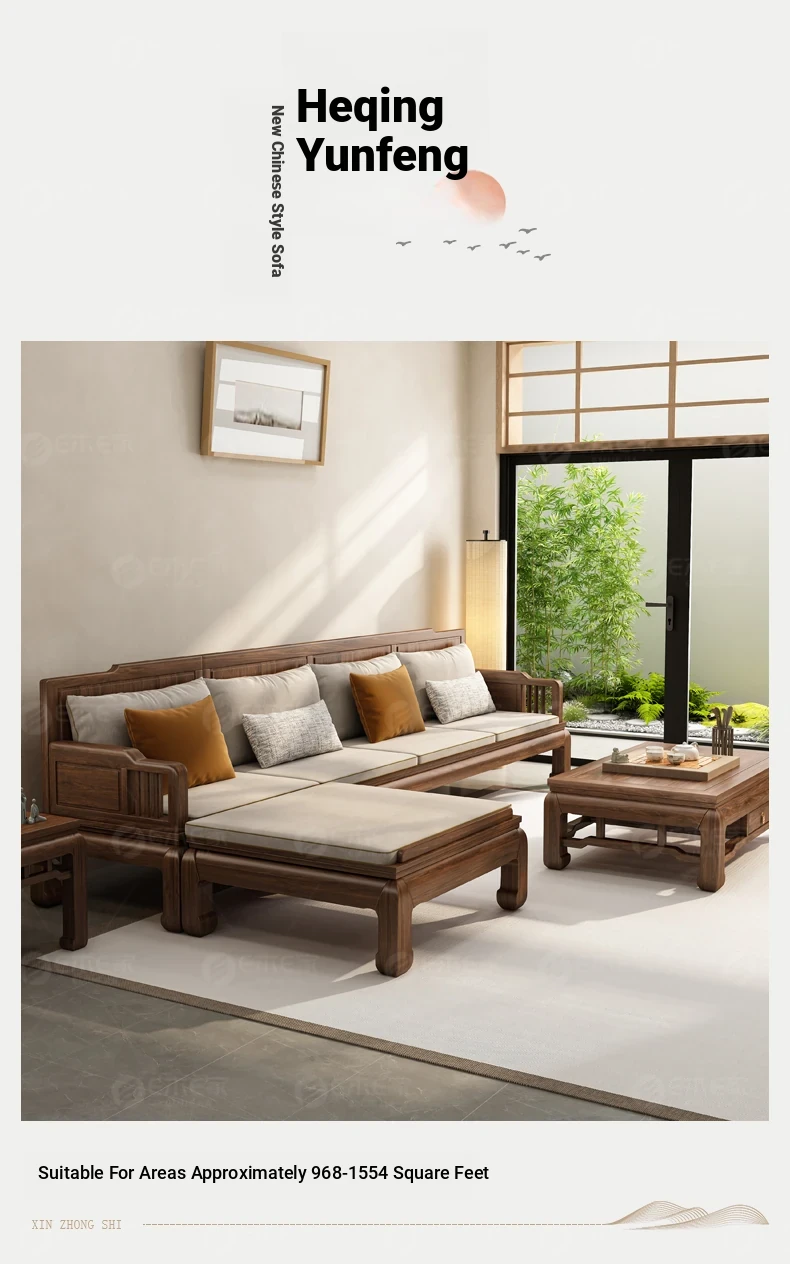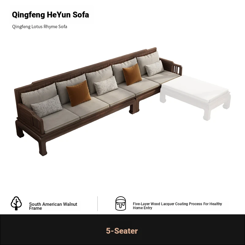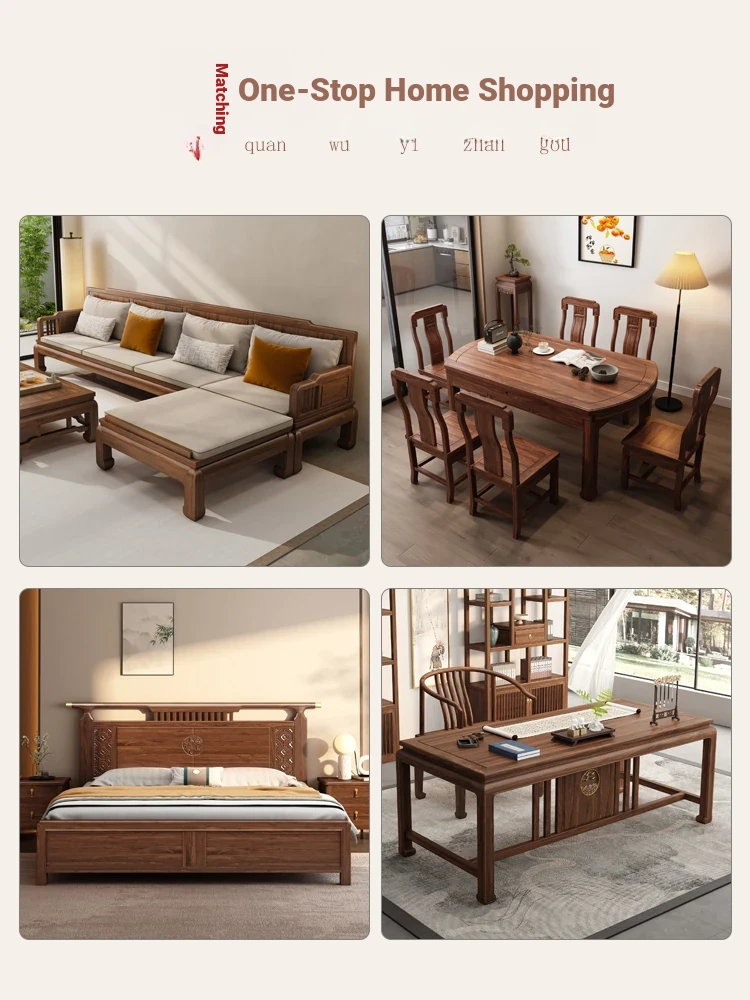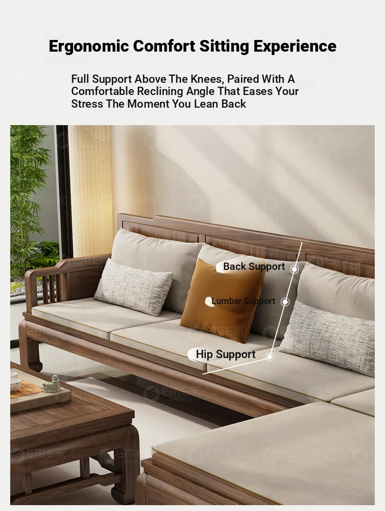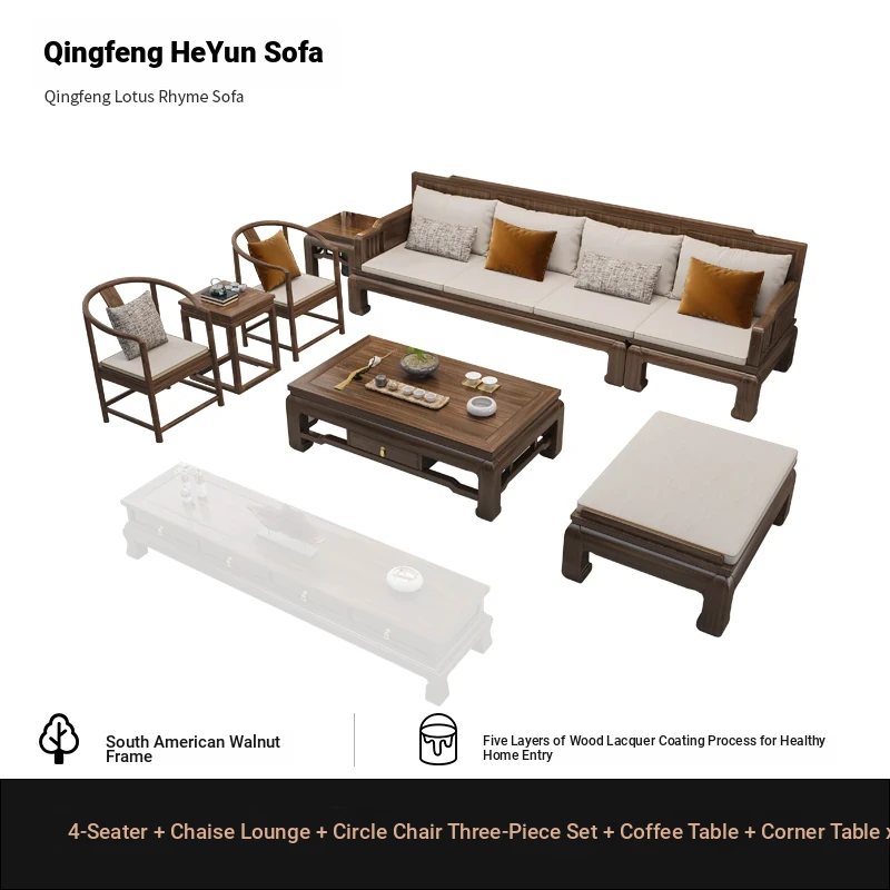 Modern Chinese Style Solid Wood Sofa Set - 4-Person Chaise Lounge Combination, Versatile for Winter and Summer, Perfect for Small Living Rooms, Walnut Wood Furniture