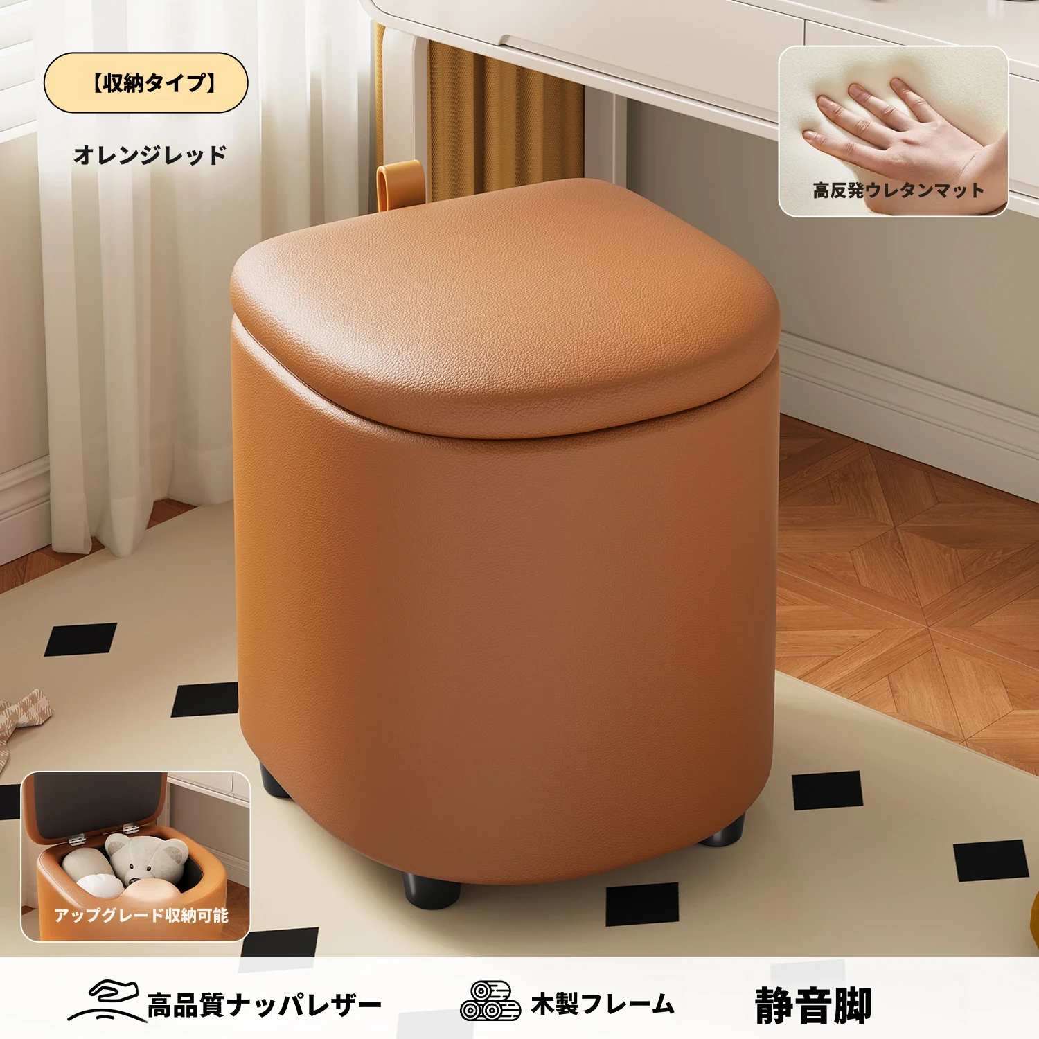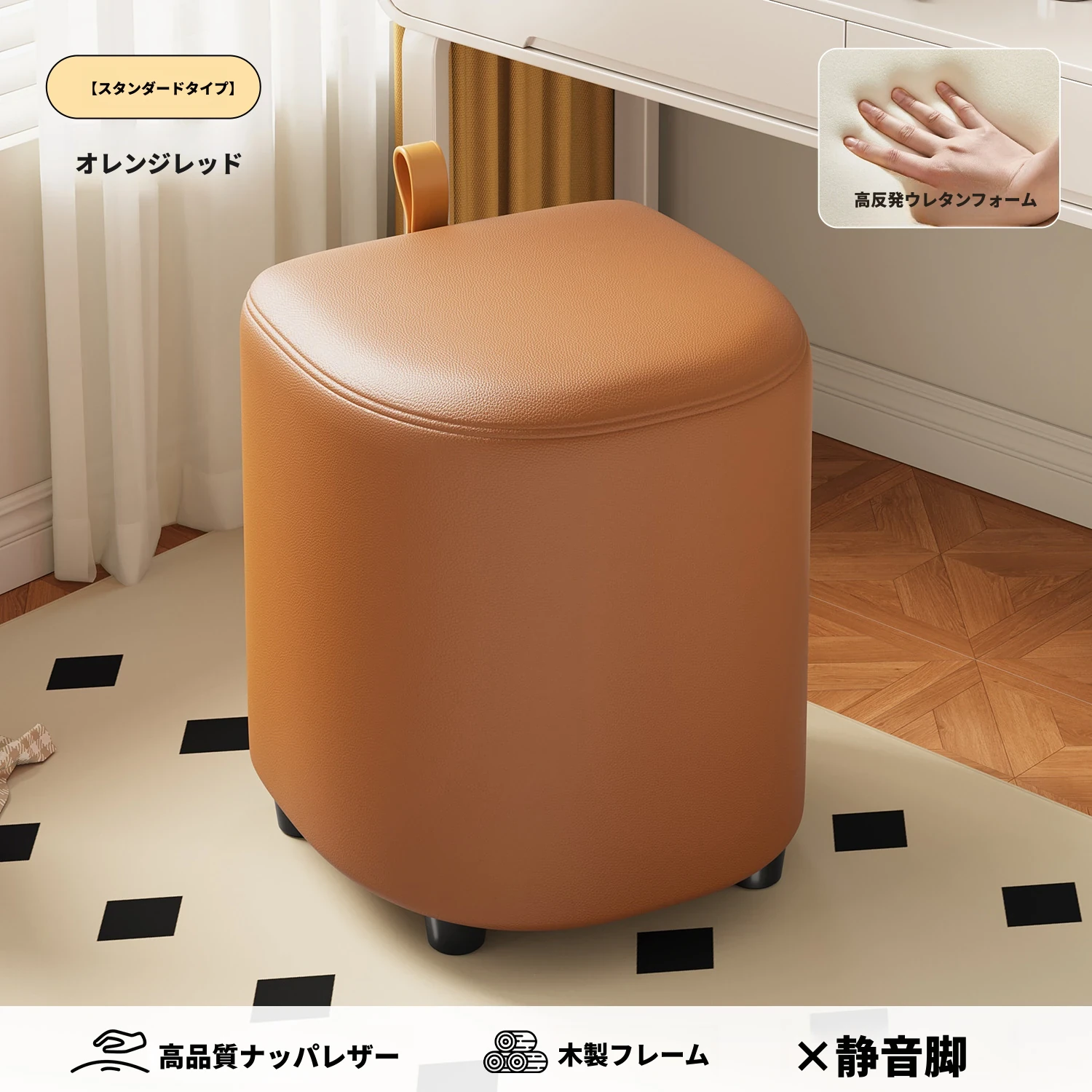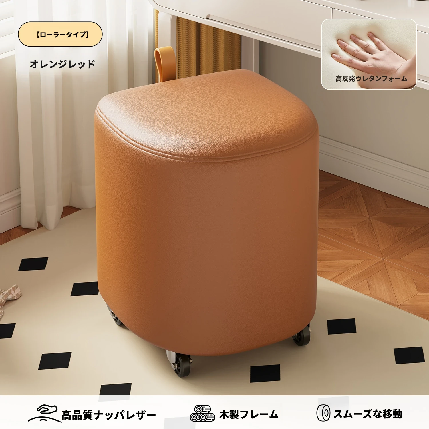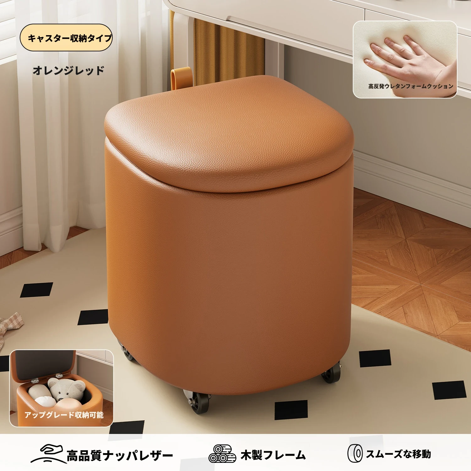 キャスター収納タイプ⭐オレンジレッド【高弾性スポンジマット】高品質ナッパレザー-360°回転