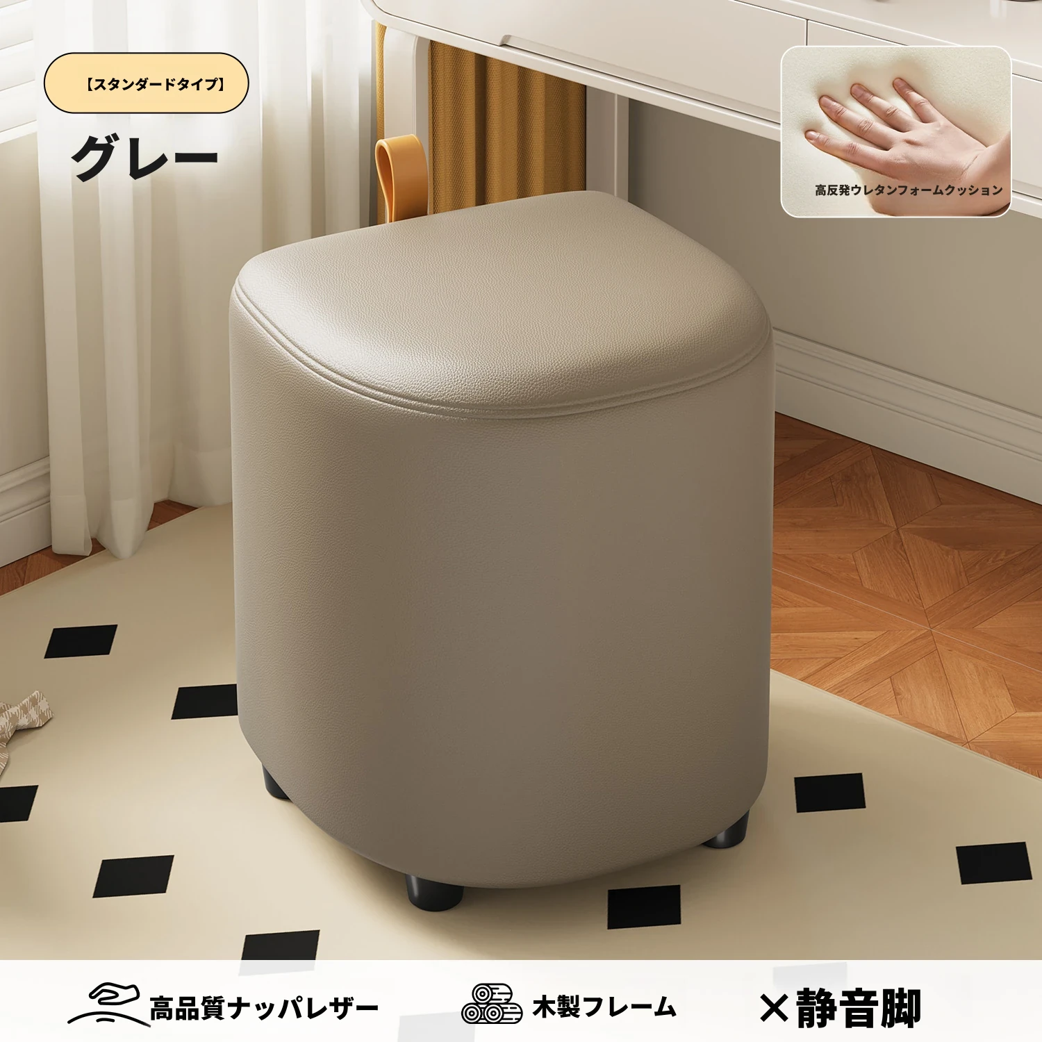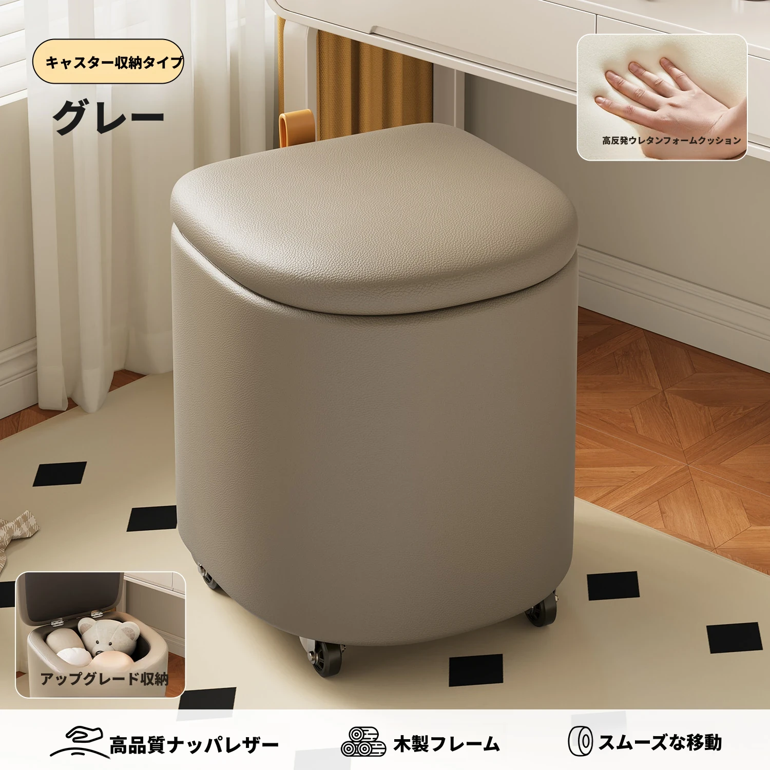 キャスター収納タイプ⭐グレー【高弾性スポンジマット】高品質ナッパレザー-360°回転