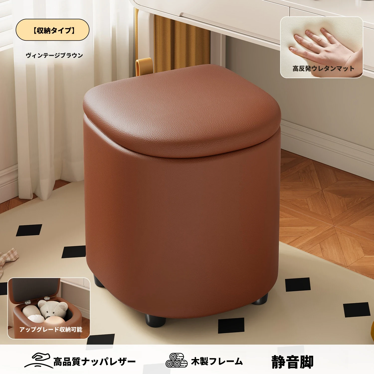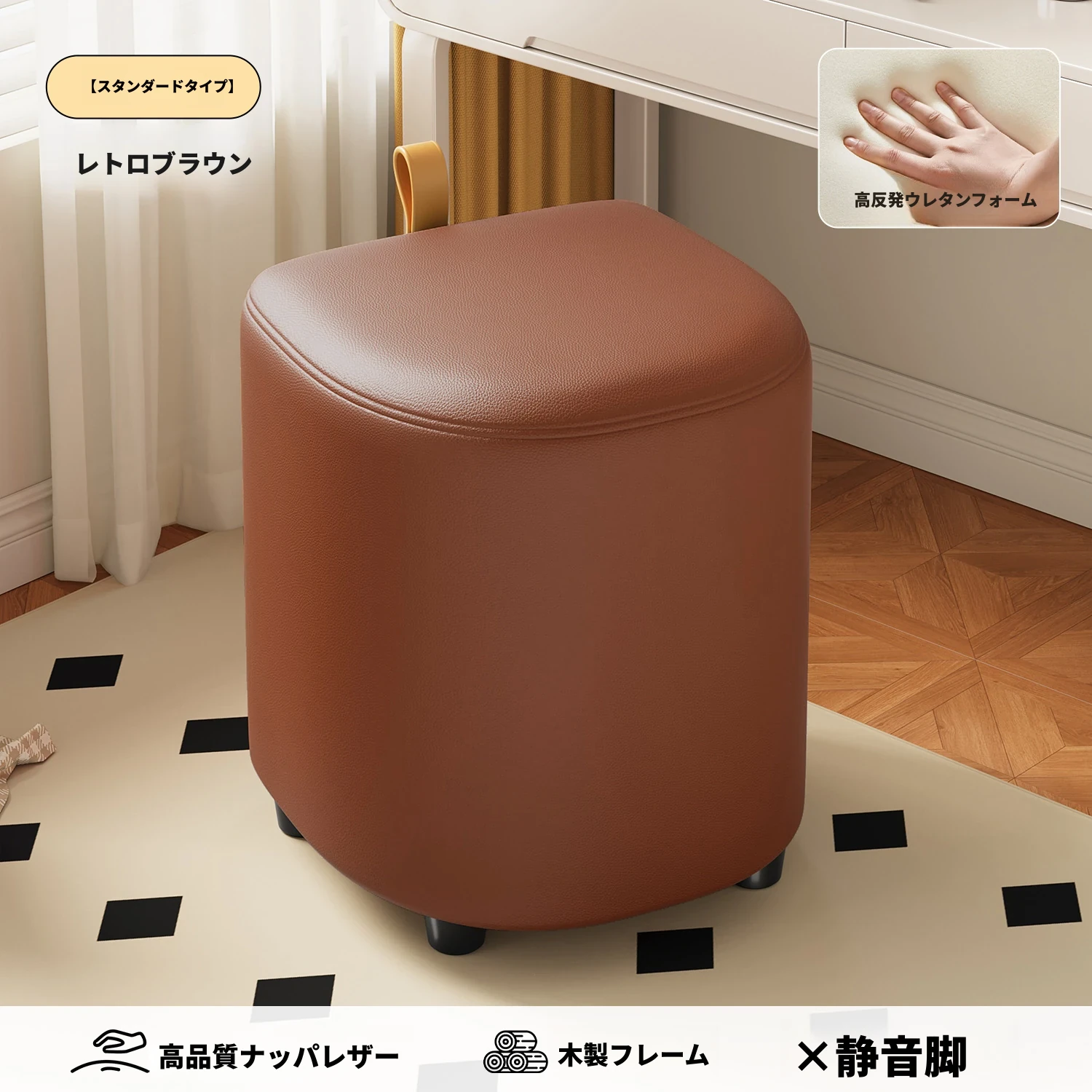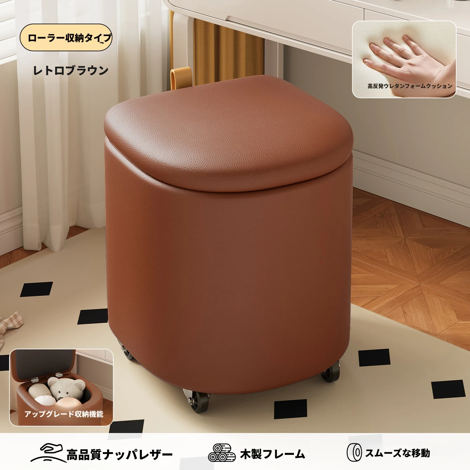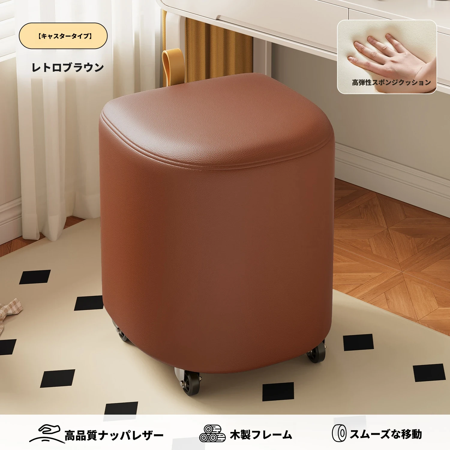 キャスター収納タイプ⭐レトロブラウン【高弾性スポンジマット】高品質ナッパレザー-360°回転