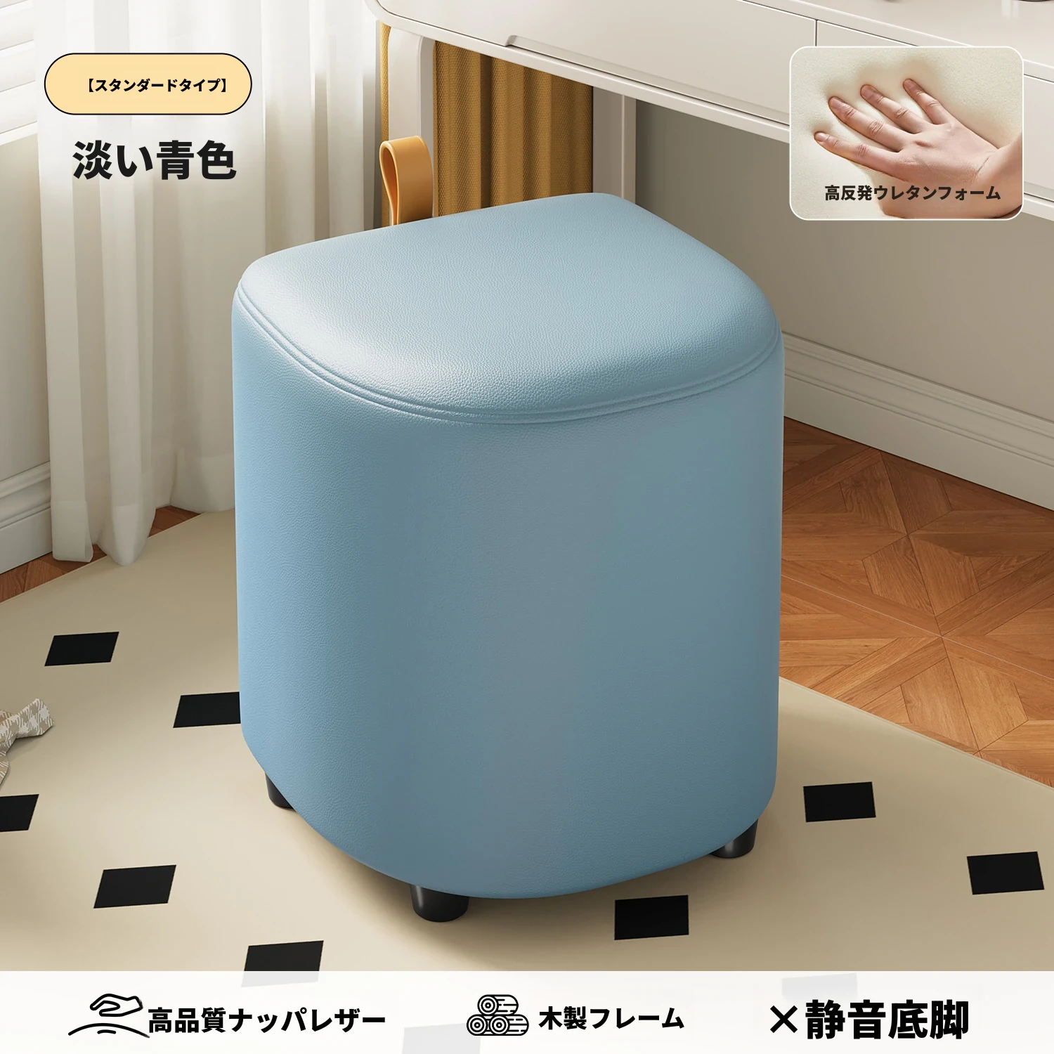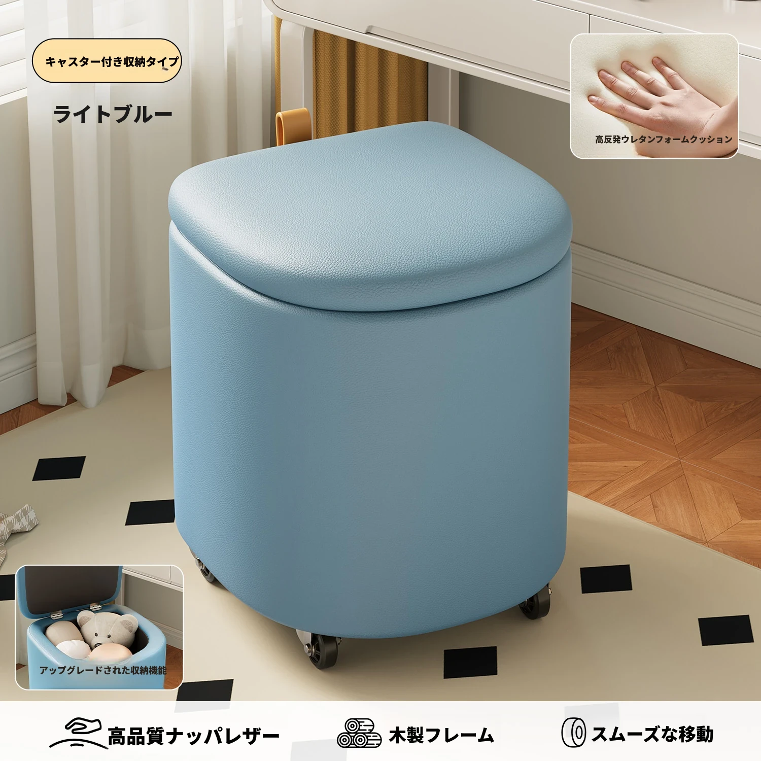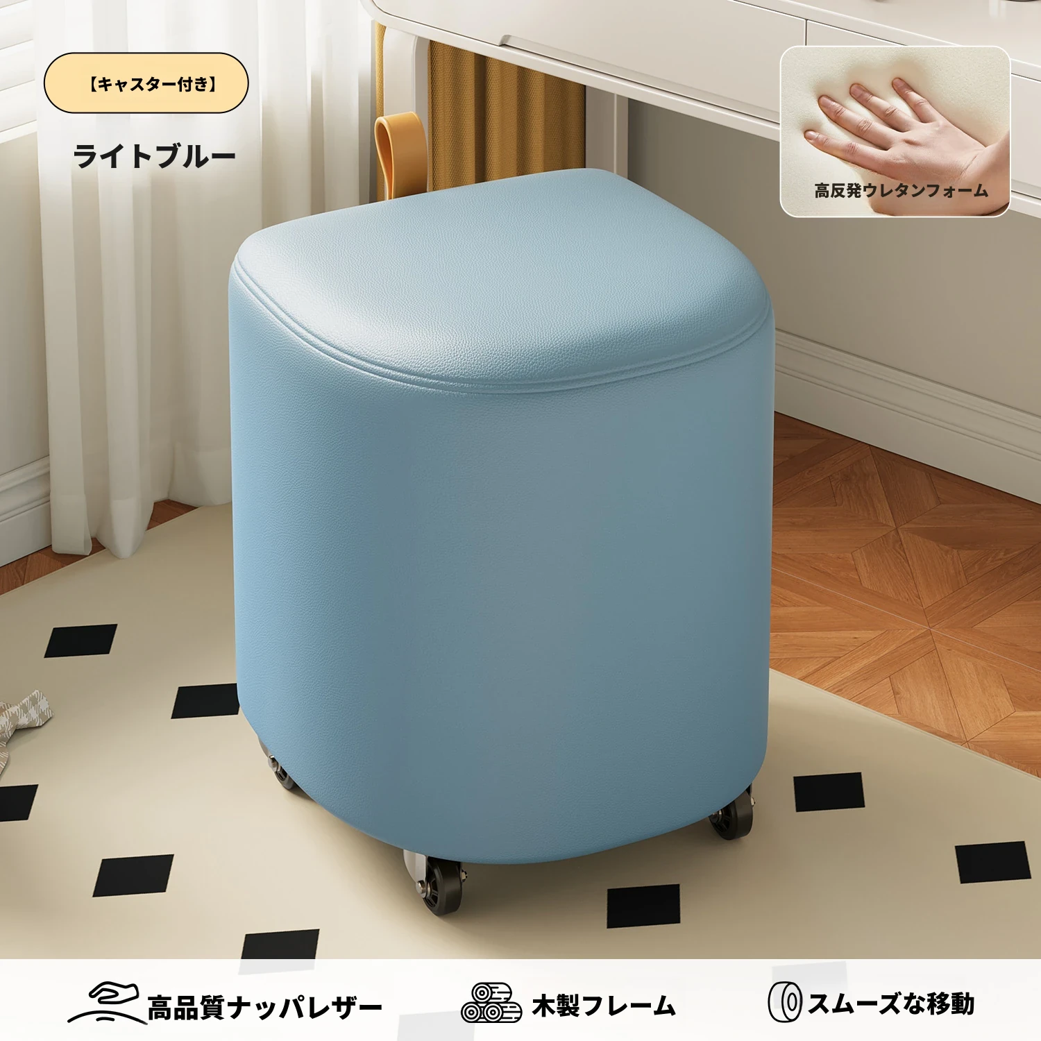 キャスター収納タイプ⭐ライトブルー【高弾性スポンジマット】高品質ナッパレザー-360°回転