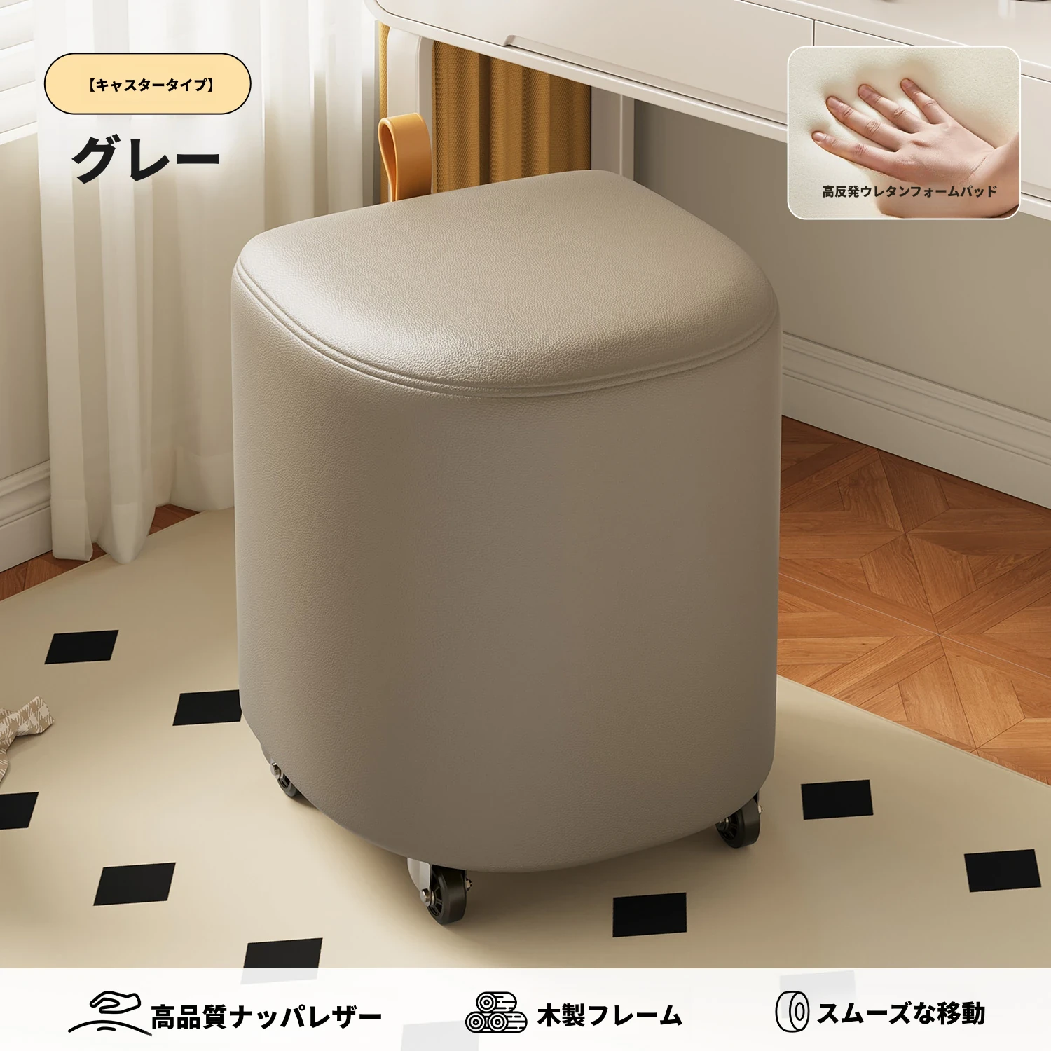 キャスタータイプ⭐グレー【高弾性スポンジマット】高品質ナッパレザー-360°回転