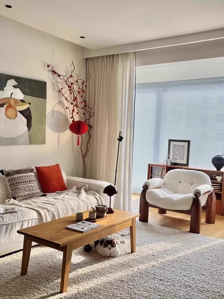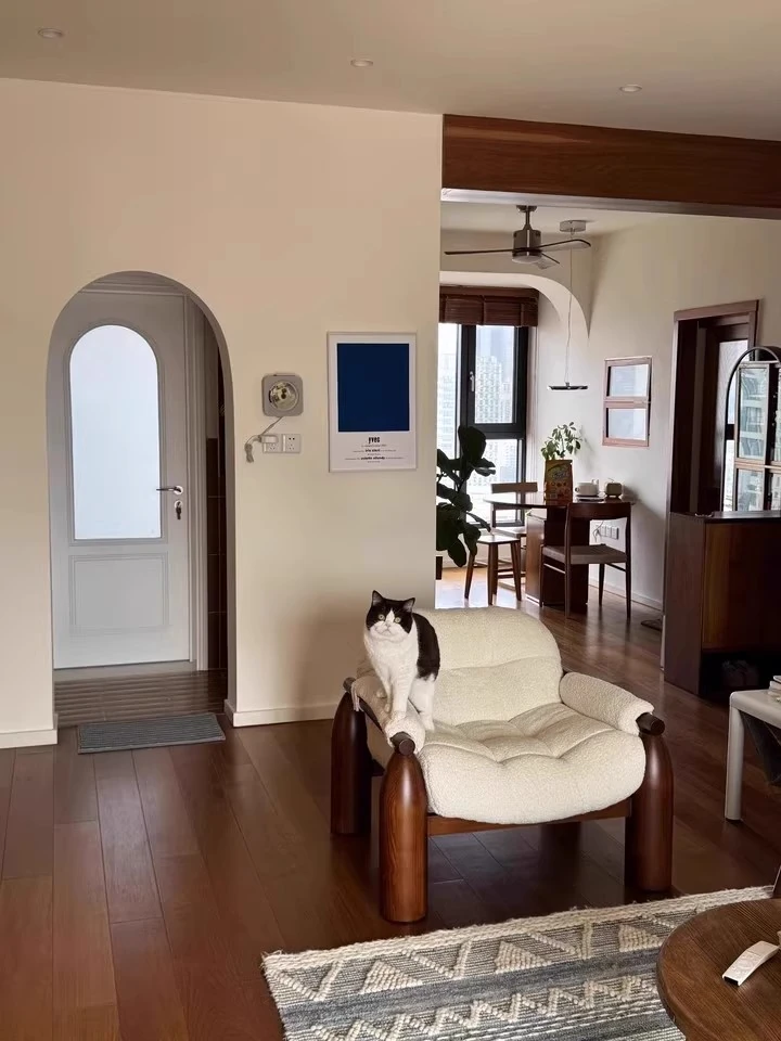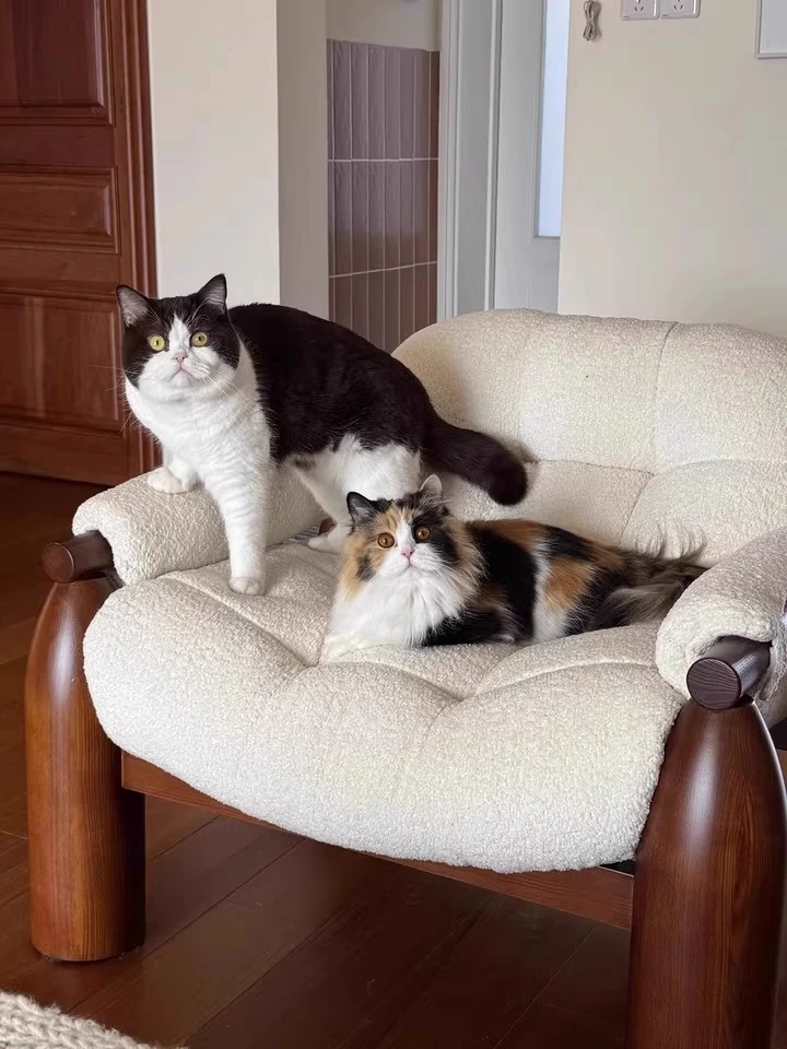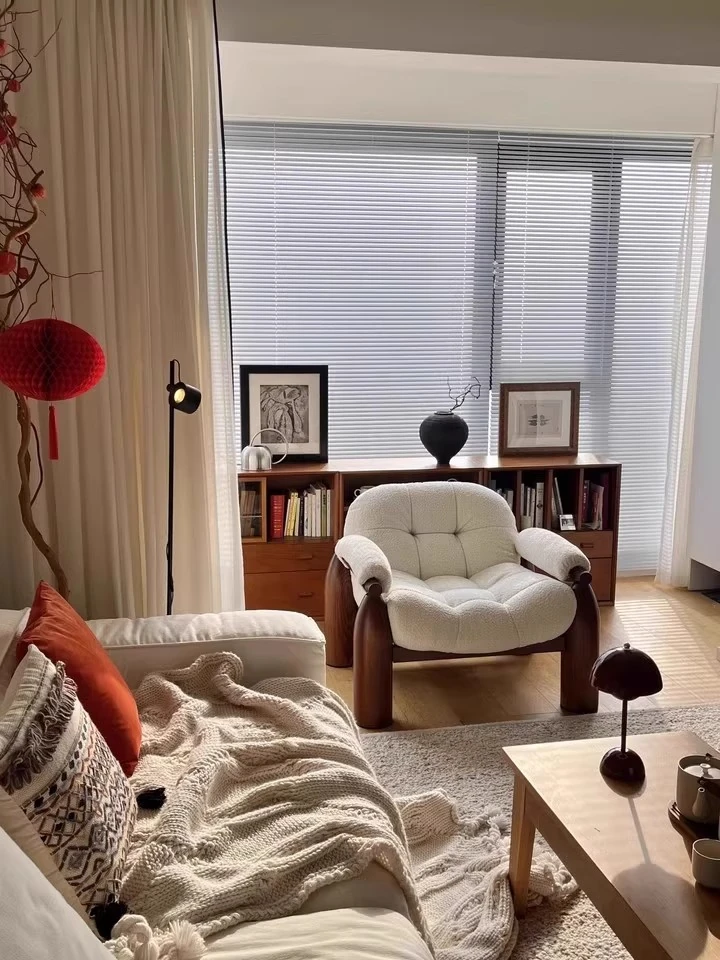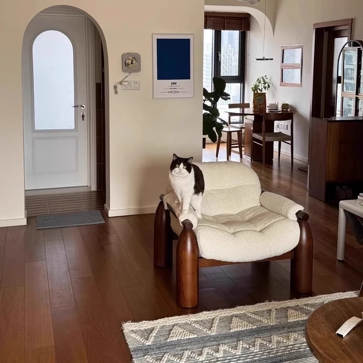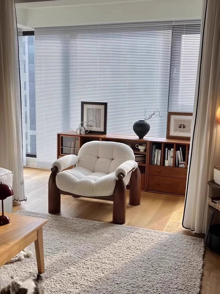 中華風デザインの布製リクライニングソファチェア|一人用ラムスキンソファ|ヴィンテージ感溢れるおしゃれな宿泊施設に最適!木製フレームで安定感抜群、リラックスした時間をお届けします。