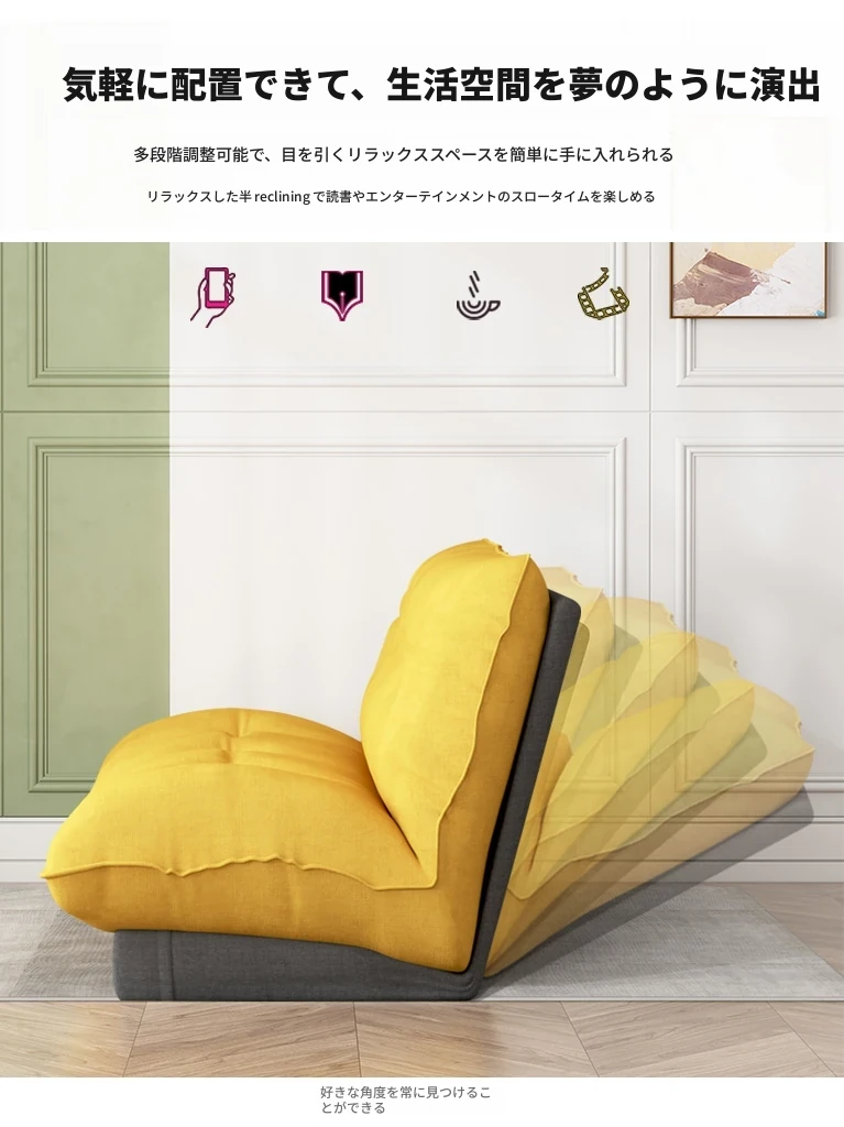 リラックスできる折りたたみソファ!授乳や宿舎に最適な座椅子、窓辺のクッションにもぴったり!脚なしデザインで省スペース、心地よい背もたれ付き。あなたのくつろぎタイムをサポートします!