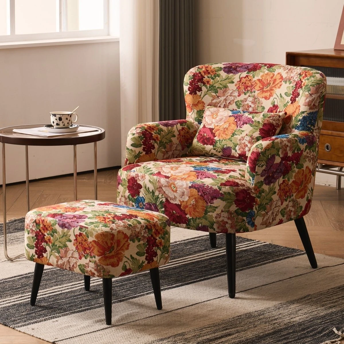 アメリカンスタイルのライトラグジュアリー1人掛けソファ|レトロなカントリーデザインのコンパクトサイズ|バルコニーやリビング、寝室にぴったり|おしゃれなフラワープリントのラウンジチェアセットでリラックス!