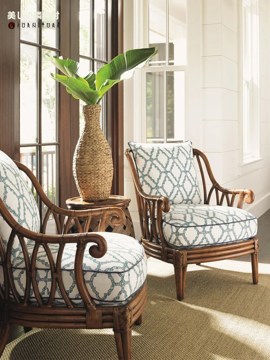 アメリカンスタイルの東南アジア製バンブー&ウッド一人掛けソファー - 南陽のリビングや庭に最適!リラックスしたひとときを提供する藤製チェア、バルコニーにもぴったりの現貨商品!