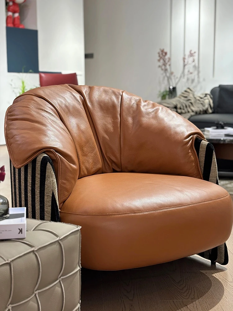 レトロデザインのイタリアンスタイル一人掛けソファ - バルコニーやリビングルーム、主寝室に最適!本革使用のおしゃれなリラックスチェア、デザイナーの特別な一脚で贅沢な空間を演出します。
